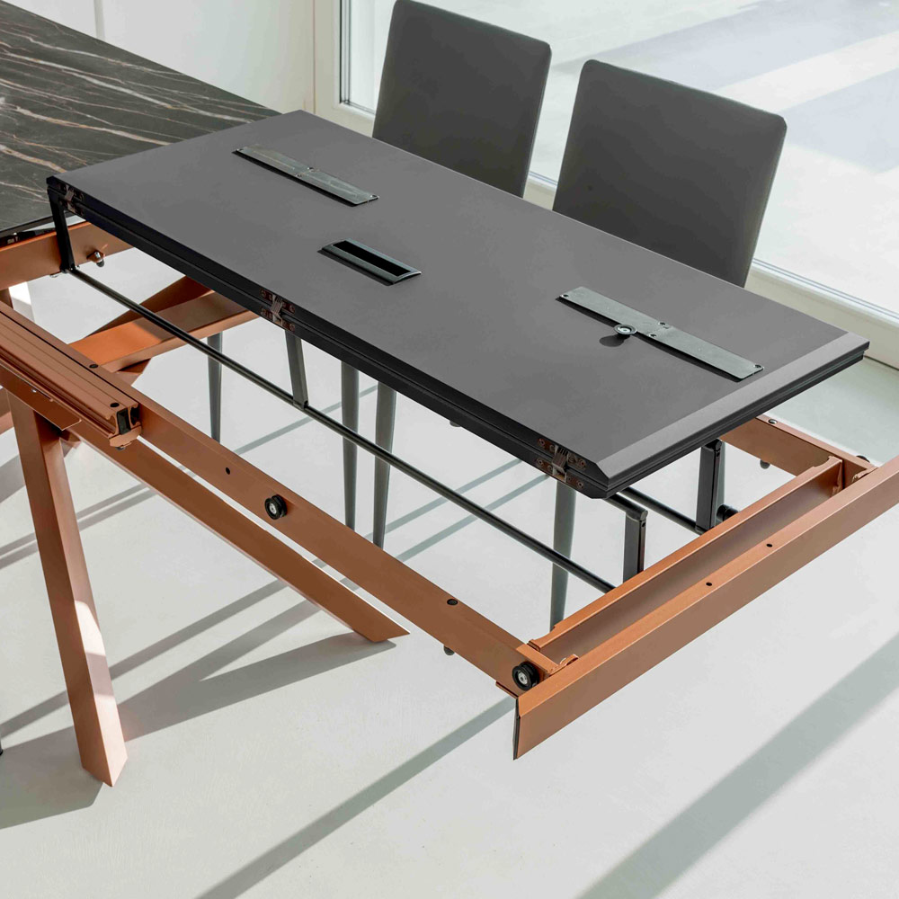 A mesa representa a síntese perfeita entre engenharia de ponta e design estético. Esta não é simplesmente uma mesa extensível, mas uma obra de arte funcional, projetada para aqueles que não querem comprometer entre estilo e espaço.