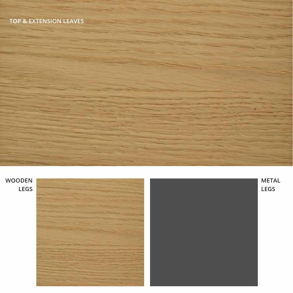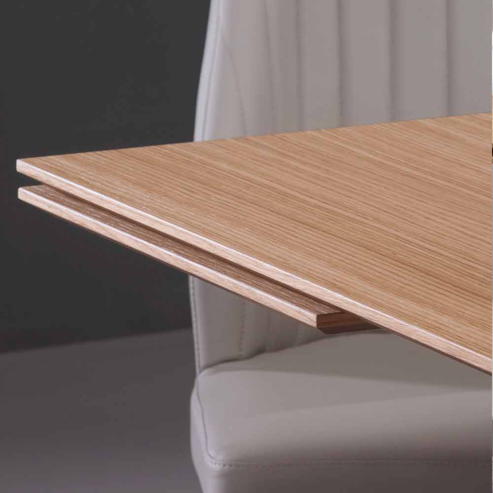 O tampo e as extensões da mesa Daryl são folheados a carvalho natural; o tampo também apresenta uma borda alargada a 45°.