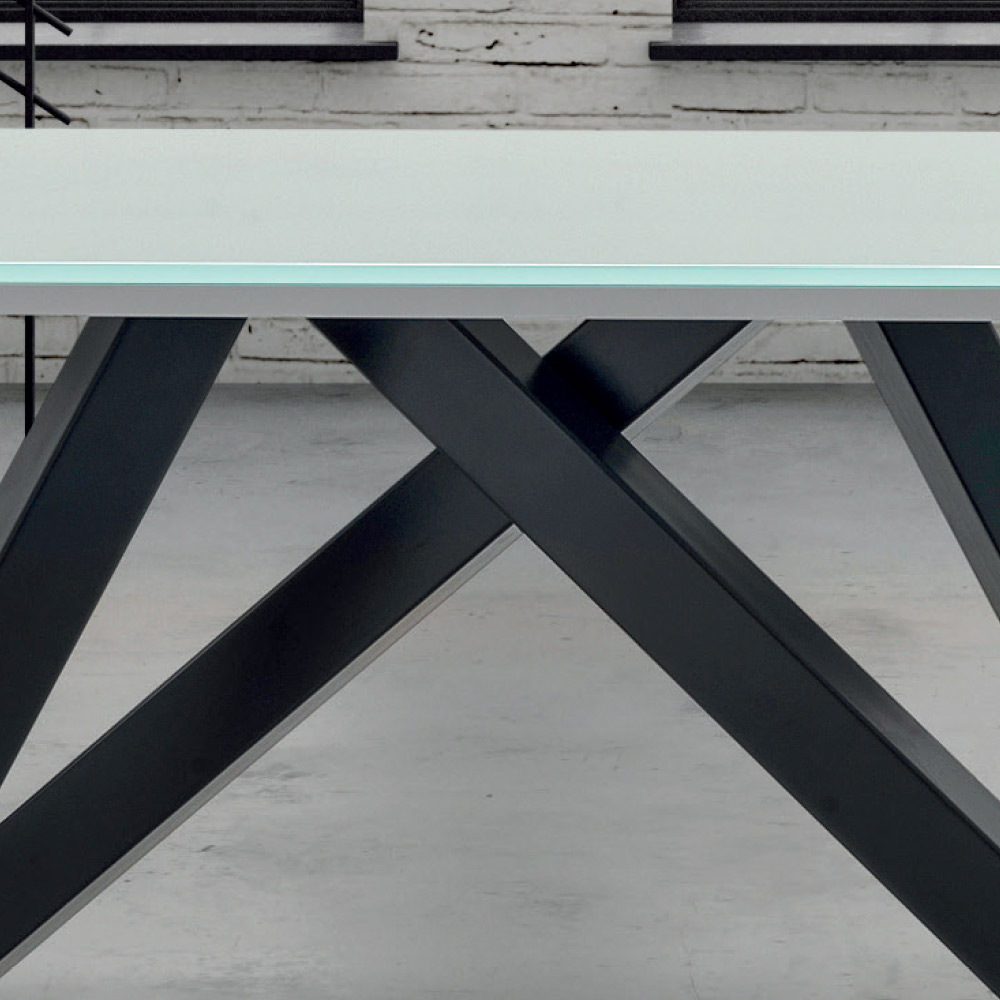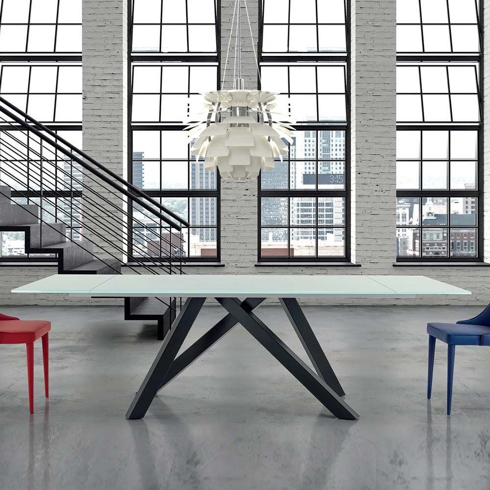 Mesa de cozinha extensível até 278 cm com tampo de vidro e base em aço preto fabricado na Itália.