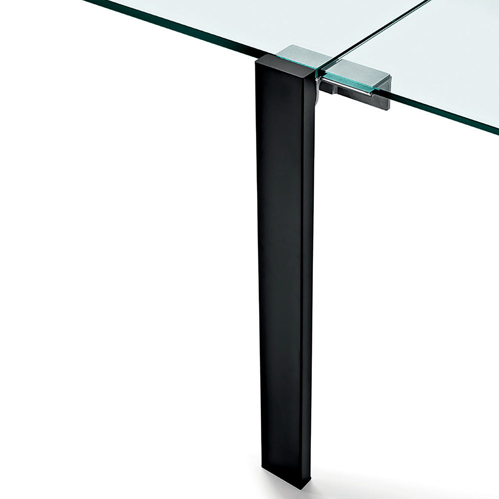 Mesa de vidro extra-claro extensível até 170 cm com base metálica, fabricada na Itália.