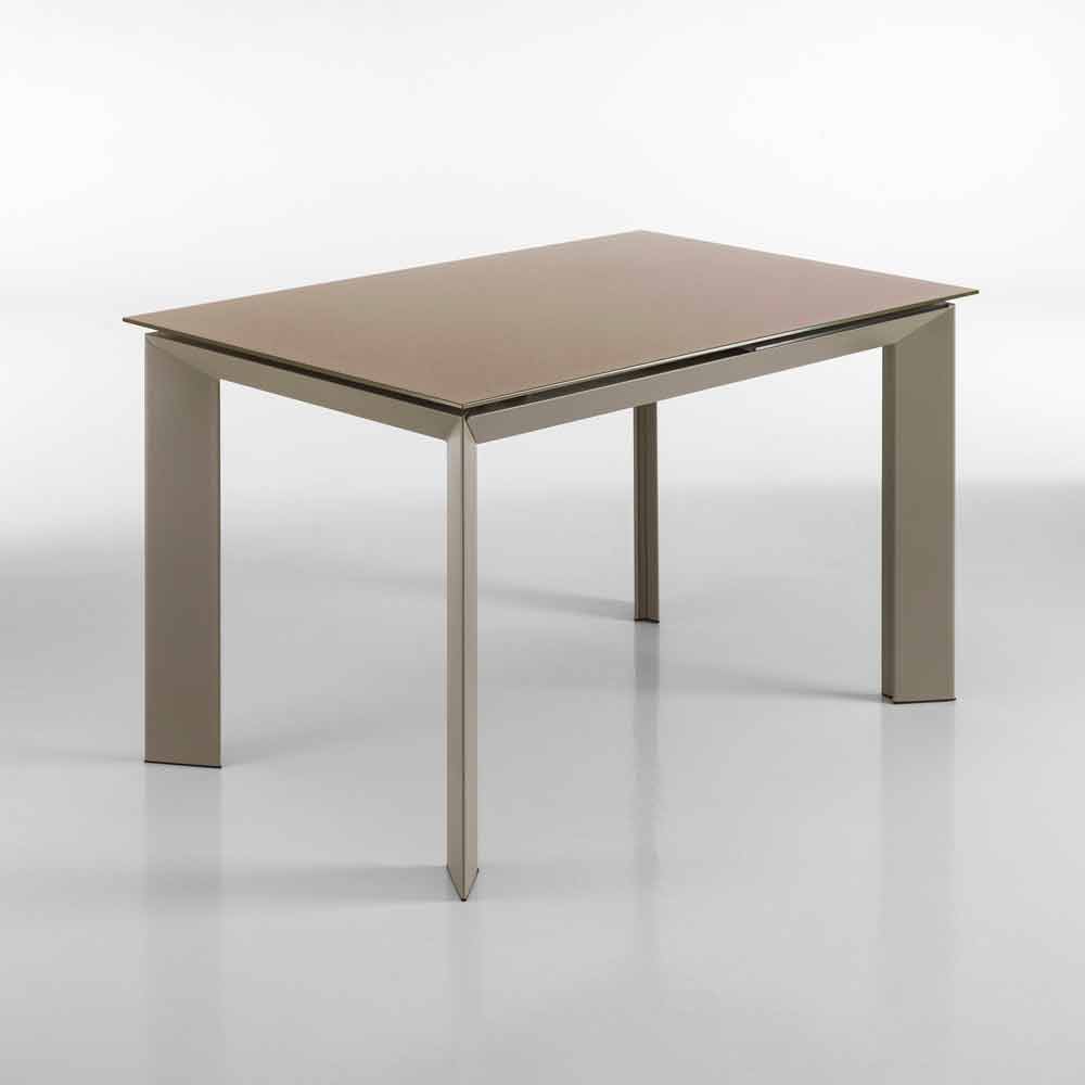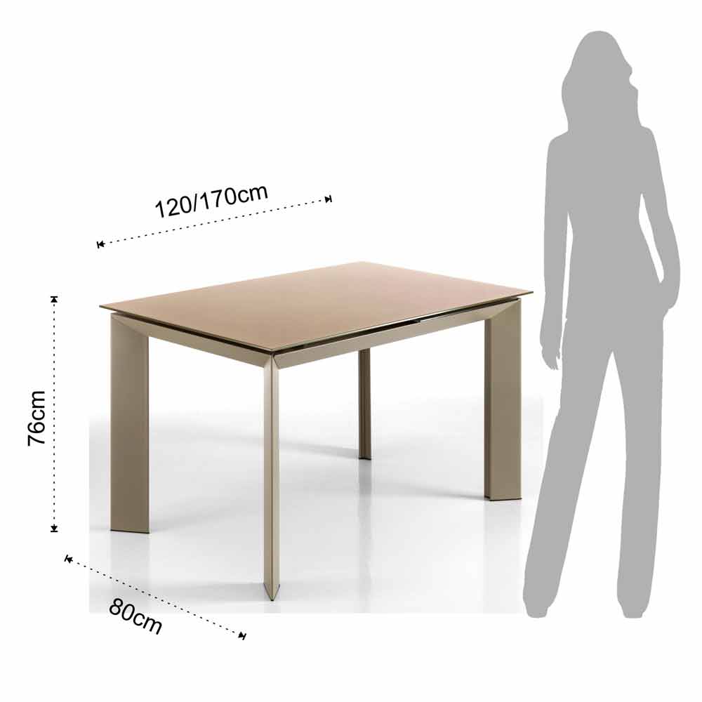 A mesa extensível de design moderno Zeno tem uma parte superior em vidro temperado pintada em cinzento com pomba, 8 mm de espessura e uma estrutura metálica pintada em cinzento com pomba.