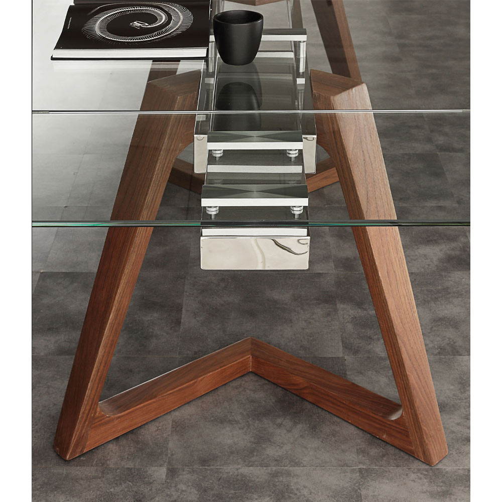 As suas bases em madeira maciça, de formato geométrico e envolvente, conferem um toque de calor natural e modernidade ao ambiente, tornando-o perfeito para qualquer interior, do clássico ao contemporâneo. O design sofisticado da mesa não só amplia a percepção do espaço com sua leveza visual, mas também garante estabilidade e resistência que só materiais de alta qualidade podem oferecer.