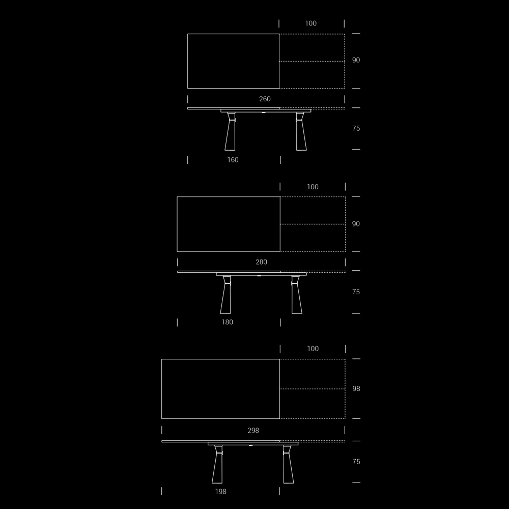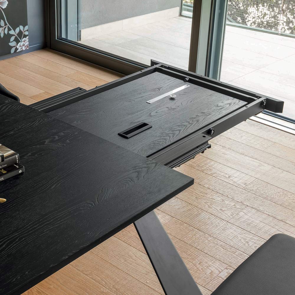extensão interna rebatível com abertura sincronizada, permite estender o tampo até um comprimento máximo de 298 cm para assim acomodar um maior número de pessoas para almoços e jantares em companhia. Uma vez fechado, volta a ocupar um espaço mínimo, oferecendo o máximo de funcionalidade aliada a uma