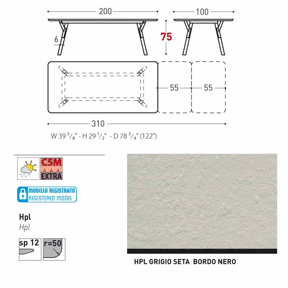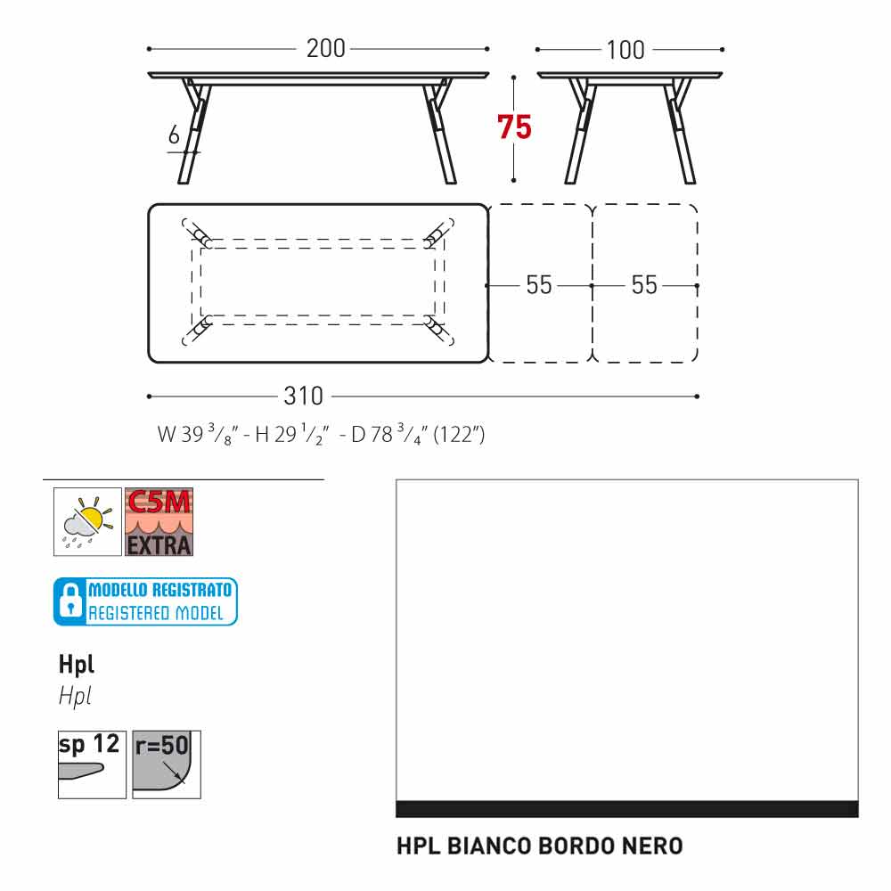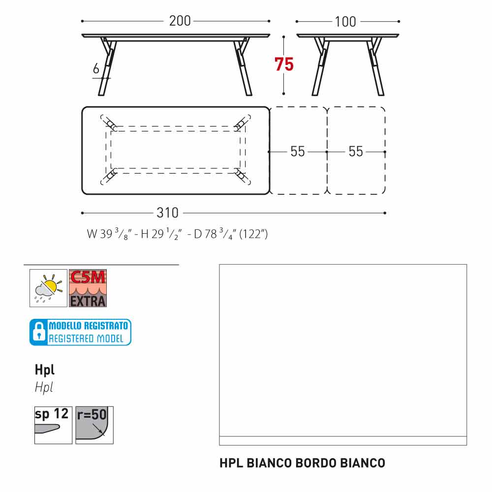 100x200 / 310xH75 cm - 2 extensões de folhas de 55 cm ciascuna