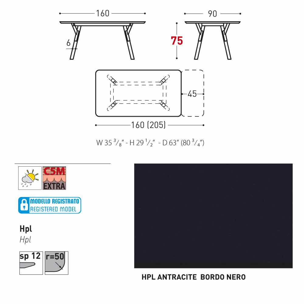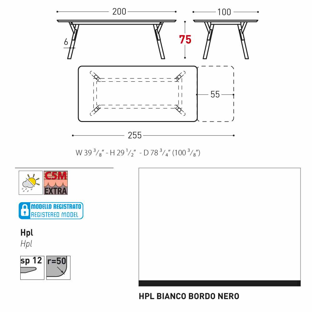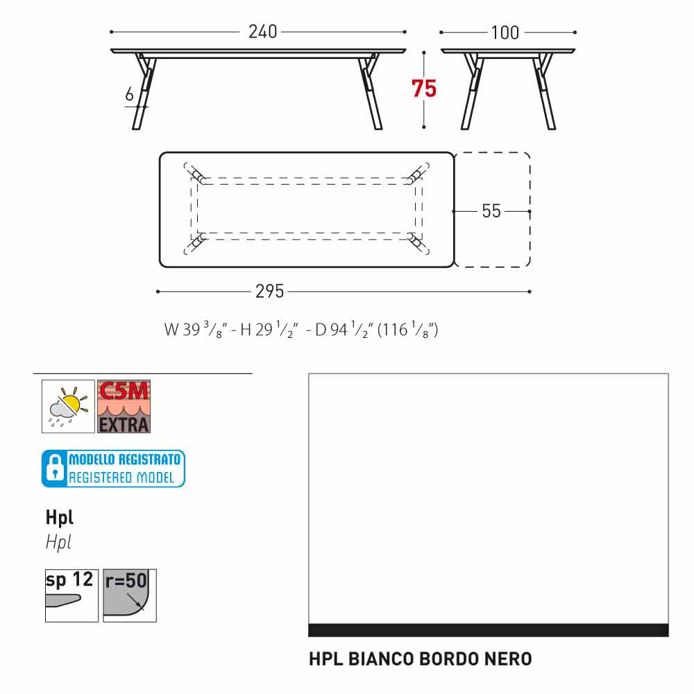 Recursos técnicos HPL : Laminados de alta pressão. Eles são feitos de várias camadas de papel (70%) impregnadas com resinas termofixas (30%) e compactadas por cerca de 45-50 minutos através da ação combinada de calor (a cerca de 150 graus) e alta pressão (superior a 7 MPa / Megapascal por metro quadrado.) O resultado é um produto estável, não reativo, não poroso e de alta densidade. Possui características físicas e químicas de alta resistência mecânica (excursão de temperatura controlada + 80 / -40 graus, por menos de 30 segundos em temperaturas extremas). Resiste à exposição à luz e variações de temperatura, mesmo em ambientes marinhos.