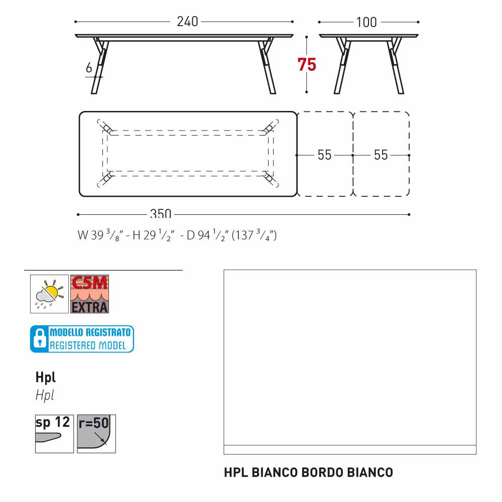 100x240 / 350x75cm - 2 folhas de extensão 55 cm ciascuna