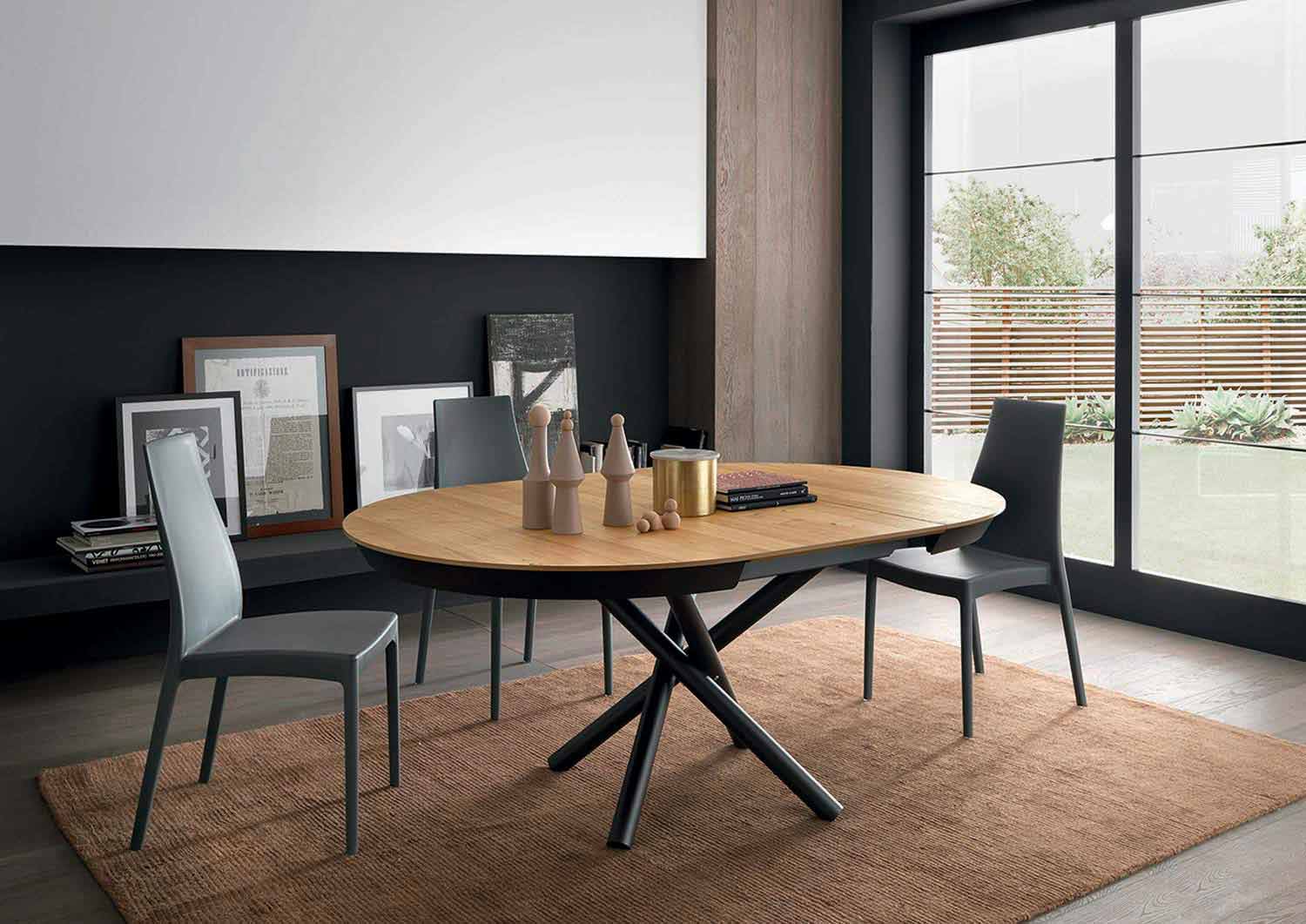 Mesa de jantar redonda extensível com tampo de madeira e base de metal Made in Italy.