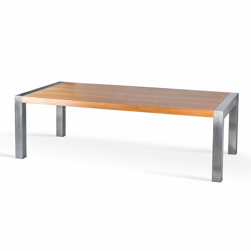 Mesa de jantar retangular, com tampo em carvalho escovado e pernas em aço.