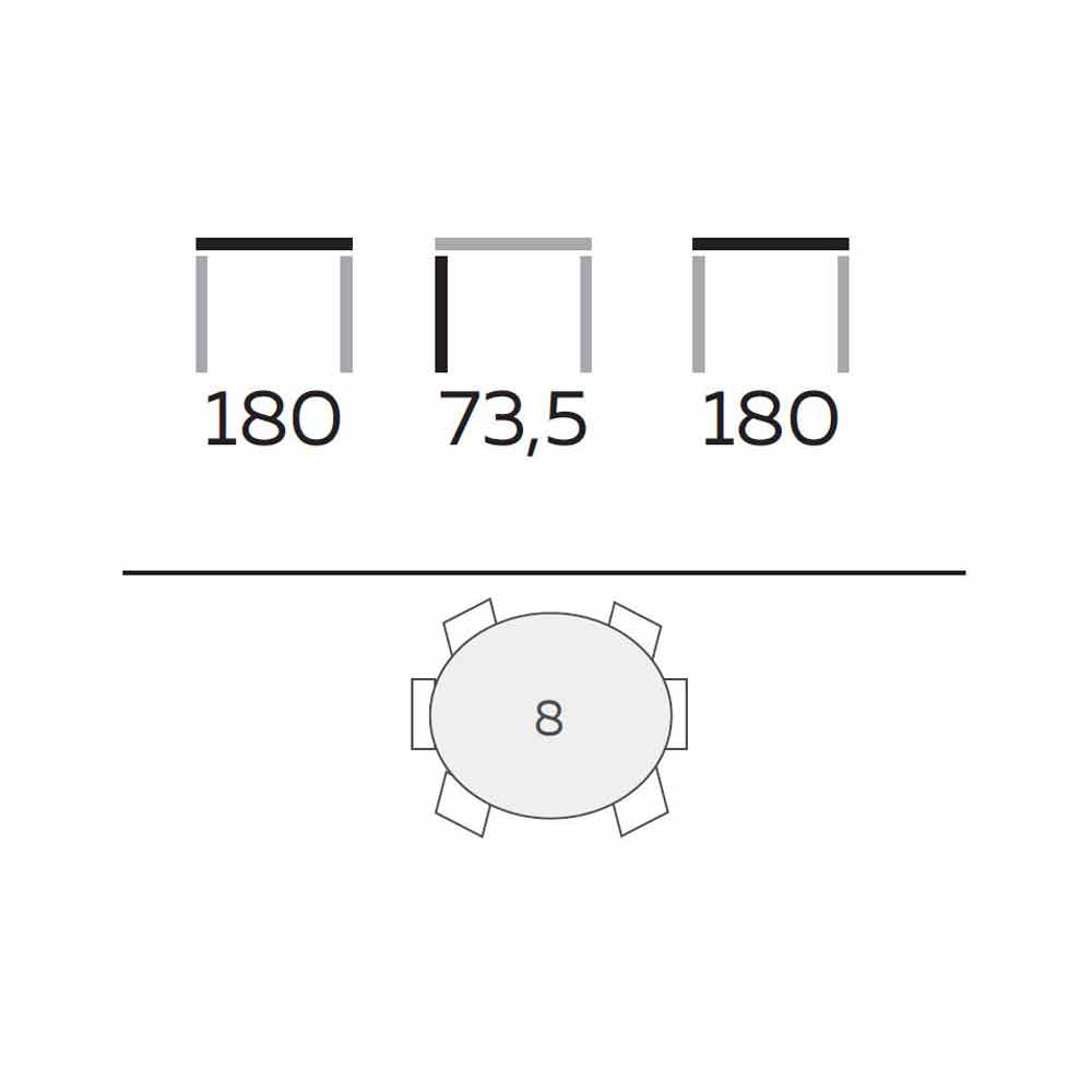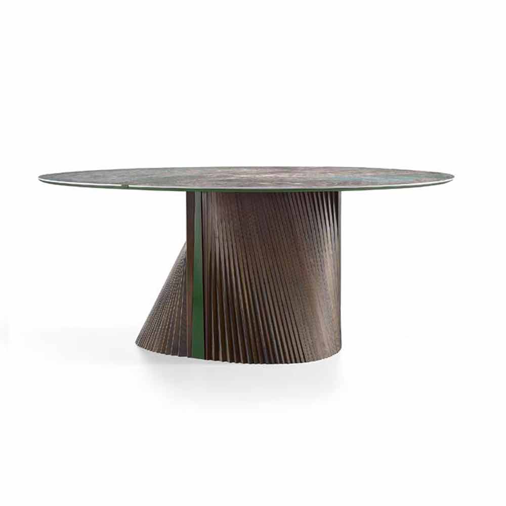 brilhante de 1,8 cm de espessura que pode acomodar até 8 pessoas, enquanto a base é feita de tiras de madeira de freixo oleadas à mão em acabamento cinza preto e é precisamente o elemento que distingue a mesa graças a as linhas fortes que dão dinamismo e movimento ao produto e a toda a divisão.