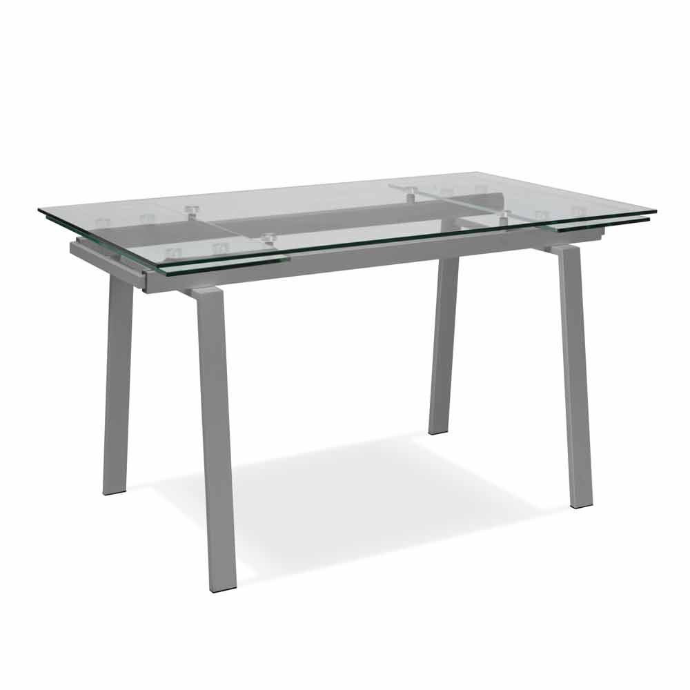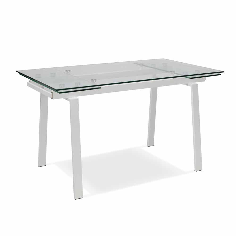 Mesa extensível de design com base de metal pintada. Tampo e extensões em vidro temperado transparente.