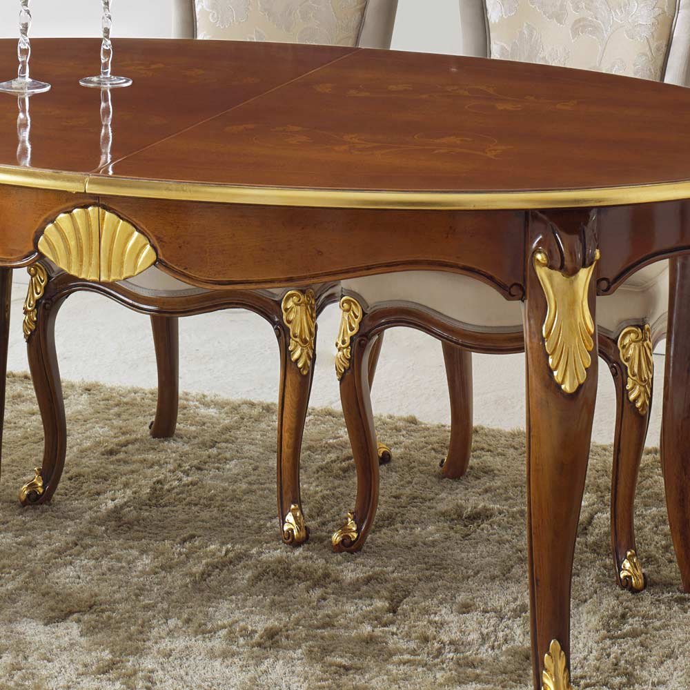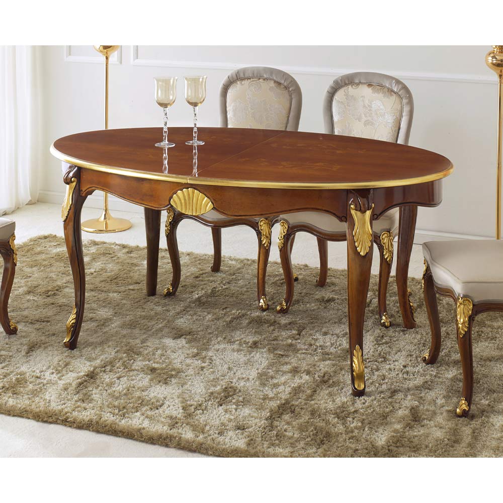 Mesa de jantar oval com tampo extensível graças a duas extensões internas de 50 cm, totalmente em madeira e disponível em nogueira Bassano e acabamentos em ouro antigo ou madeira branca e dourada. Um complemento único e refinado, totalmente