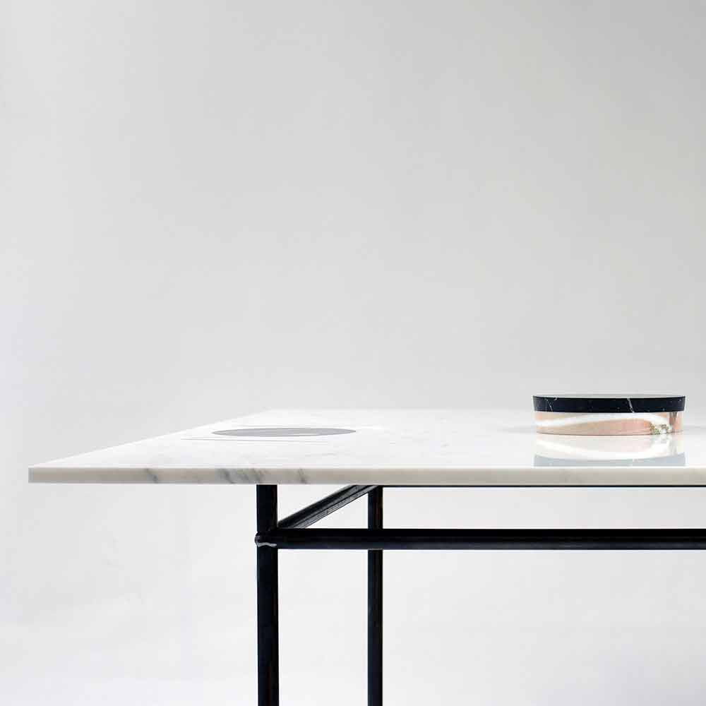Para concluir a obra, uma estrutura simples e minimalista em metal pintado desenhada para suportar o tampo.