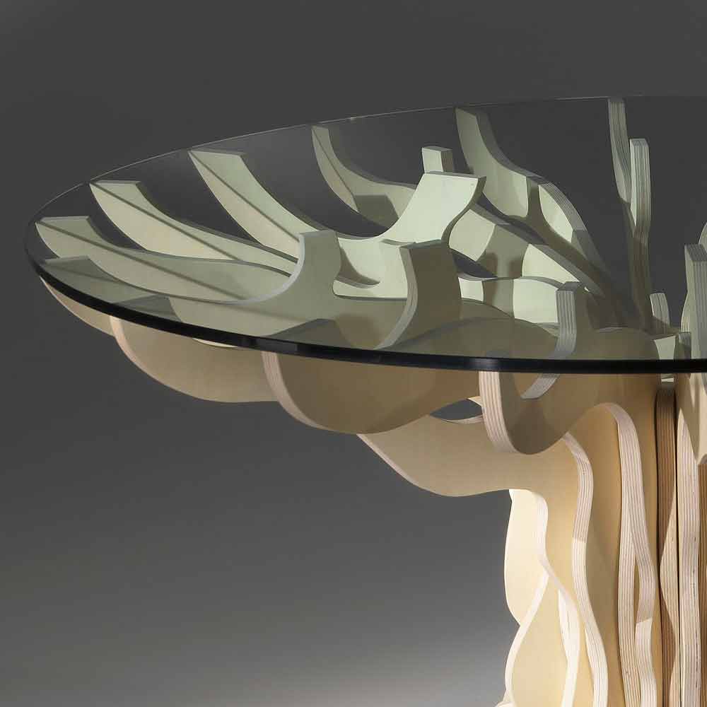 Mesa de jantar redonda feita de madeira com tampo de cristal temperado Cassia, fabricada na Itália