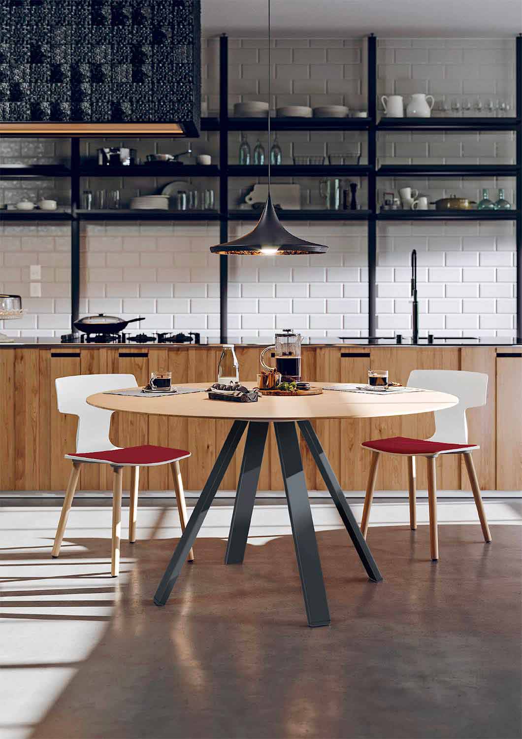 A mesa da sala de jantar é caracterizada por uma estrutura metálica pintada de branco ou preto , composta por 4 pernas, dispostas em um padrão de raios de sol que permitem estabilidade e robustez . A base também permite que a mesa adquira elegância e versatilidade, tornando-a facilmente combinável com qualquer estilo de mobiliário. A parte superior é feita de MDF cor de carvalho e está disponível em 2 diâmetros diferentes para se adaptar perfeitamente a todas as necessidades.
