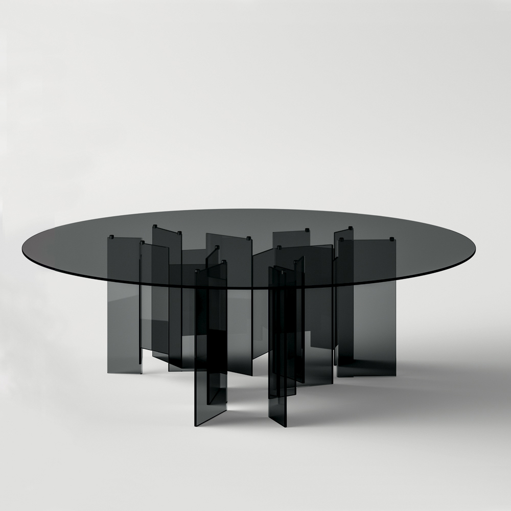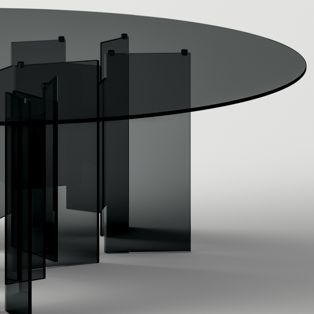 Mesa de jantar totalmente em vidro com base de formas geométrica que suporta um elegante tampo redondo . Uma solução de decoração que vem de um processo de produção Made in Italy através do processamento especializado de vidro por artesãos qualificados que permitem dar vida à combinação perfeita de qualidade , design e funcionalidade .
