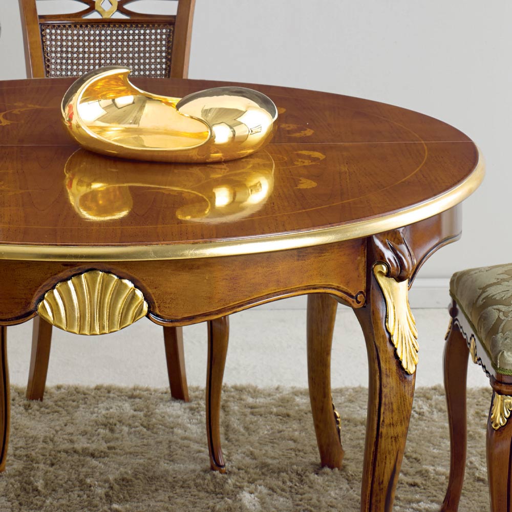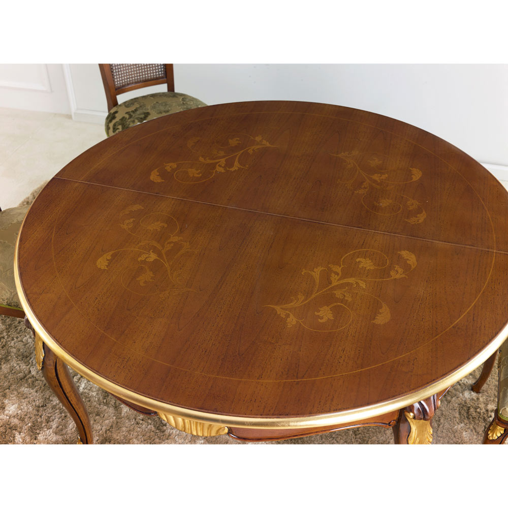 Mesa de jantar com tampo redondo extensível até 240 cm graças a duas extensões internas de 50 cm, totalmente em madeira e disponível em nogueira Bassano e acabamentos em ouro antigo ou madeira branca e prata.