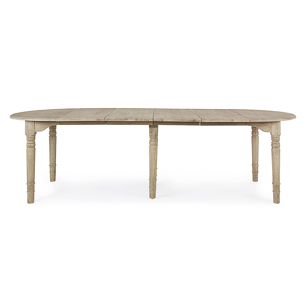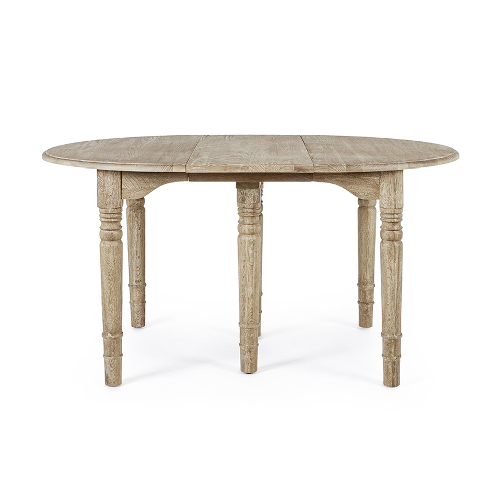 Mesa de jantar redonda e extensível em madeira com acabamento envelhecido até 10 pessoas.