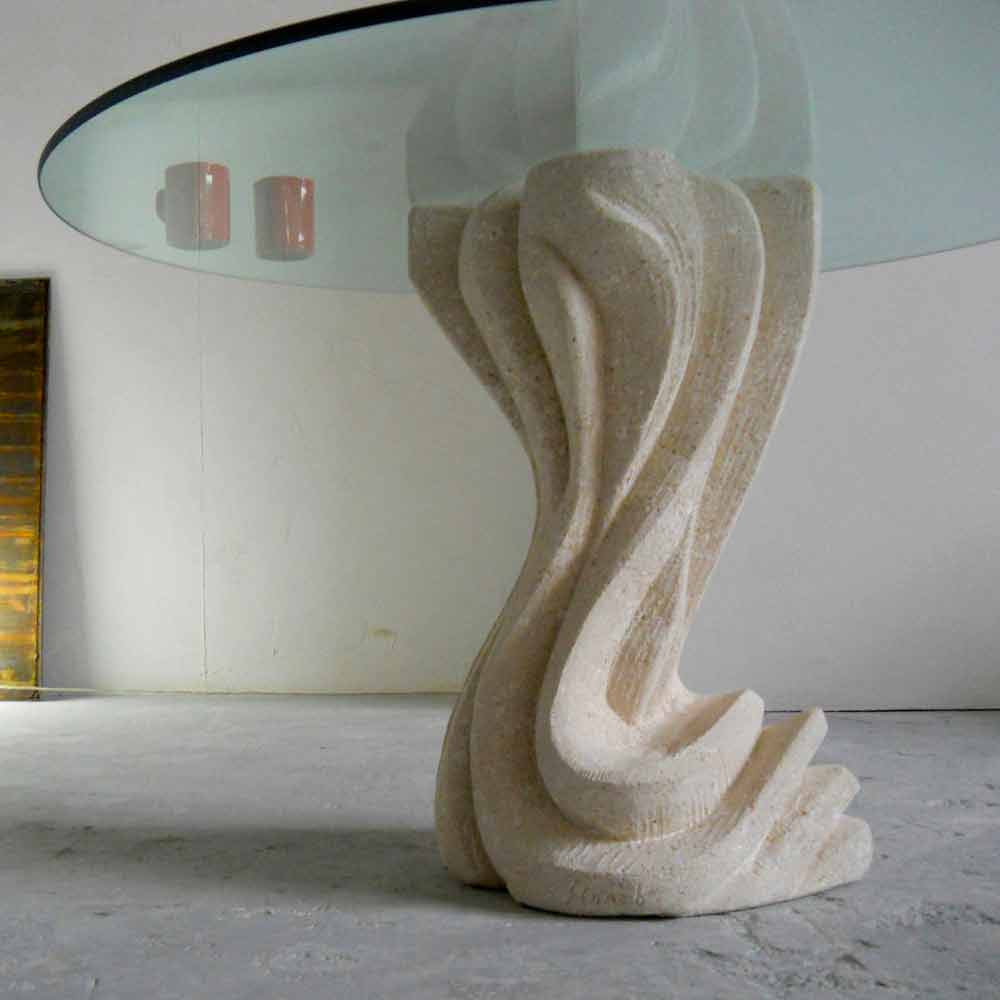 A mesa de jantar Cadmo é inteiramente feita na Itália. Sua base é feita de pedra natural Vicenza e foi esculpida à mão a partir do bloco de pedra original. O tampo da mesa é feito de cristal flutuante (15 mm de espessura) que foi fixado à base com uma flange de aço extraível.
