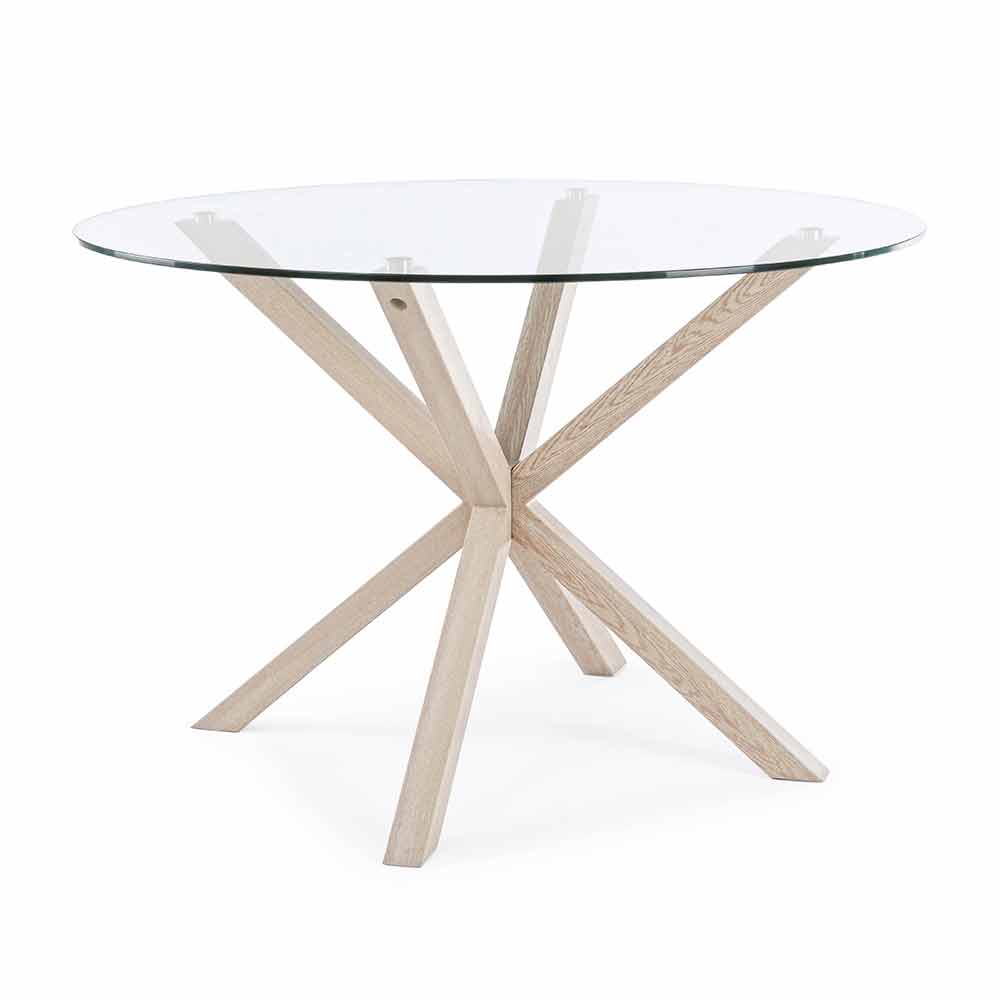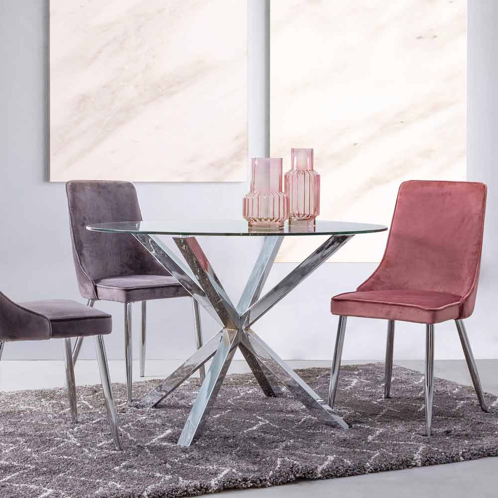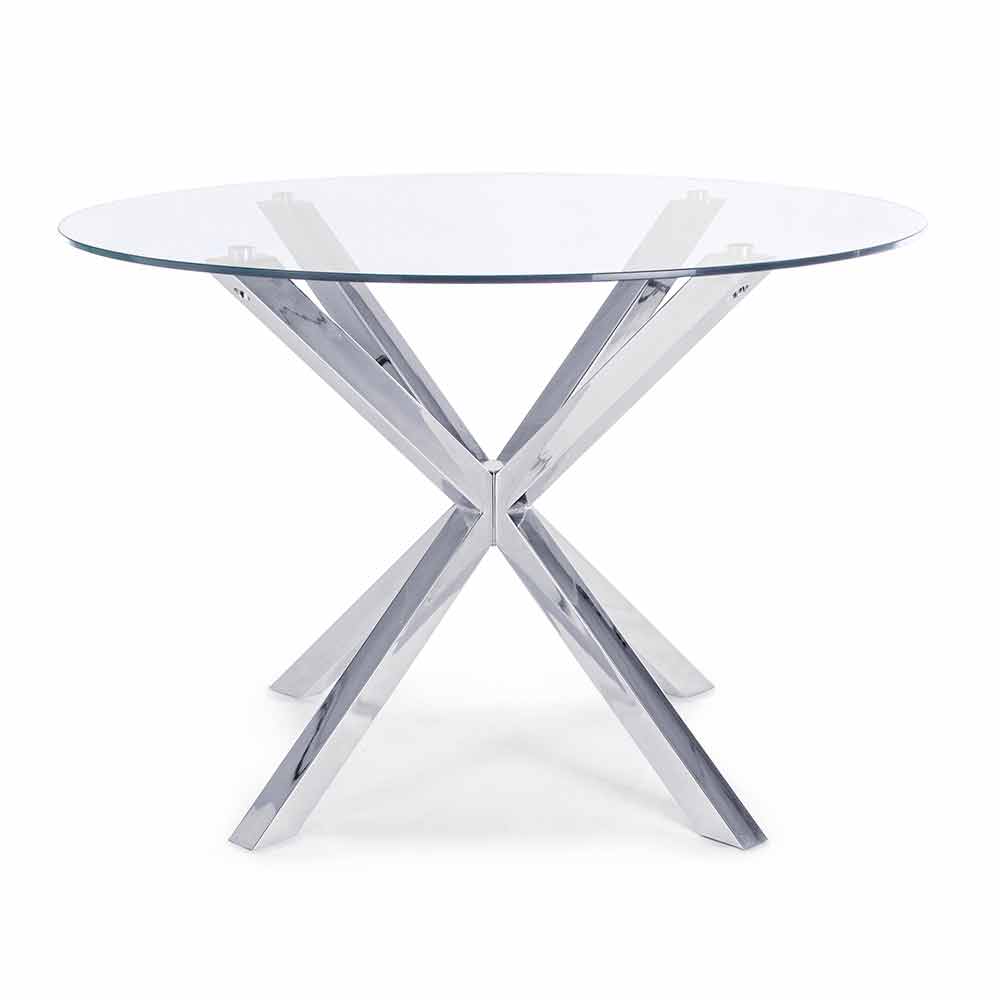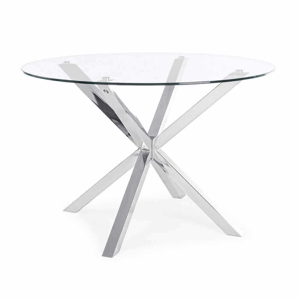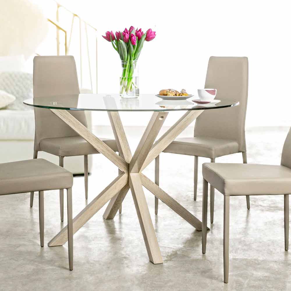 Mesa de jantar moderna com tampo redondo de vidro temperado.
