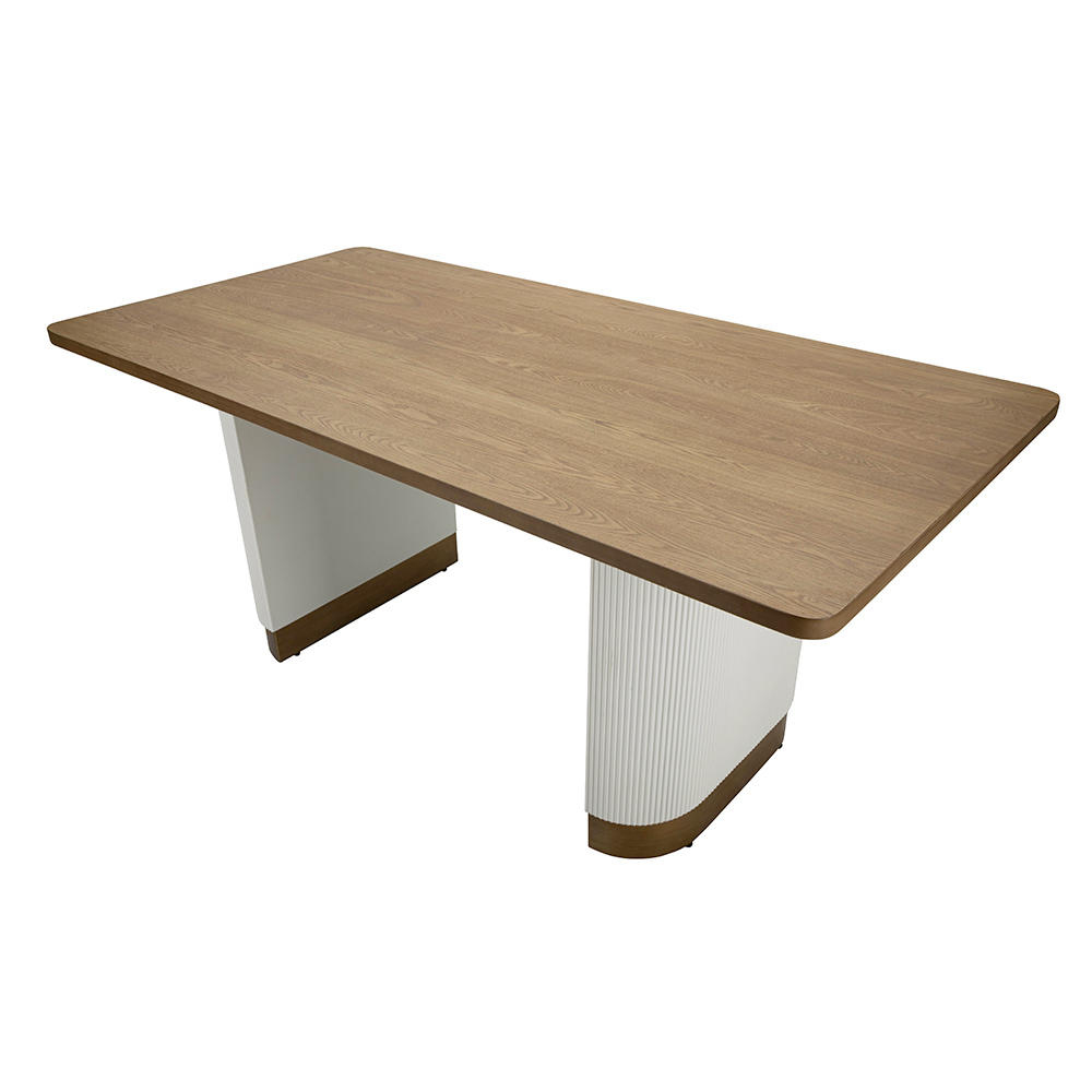 Esta mesa de jantar é uma síntese impecável de estilo e funcionalidade , uma peça de mobiliário pensada para enriquecer qualquer ambiente com a sua presença discreta mas distinta. A superfície em MDF, de tons quentes naturais, contrasta harmoniosamente com a base branca com sulcos verticais, oferecendo uma textura visual refinada e um design inspirado nos elementos da arquitetura clássica.