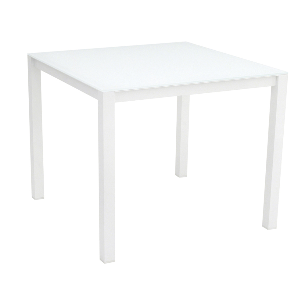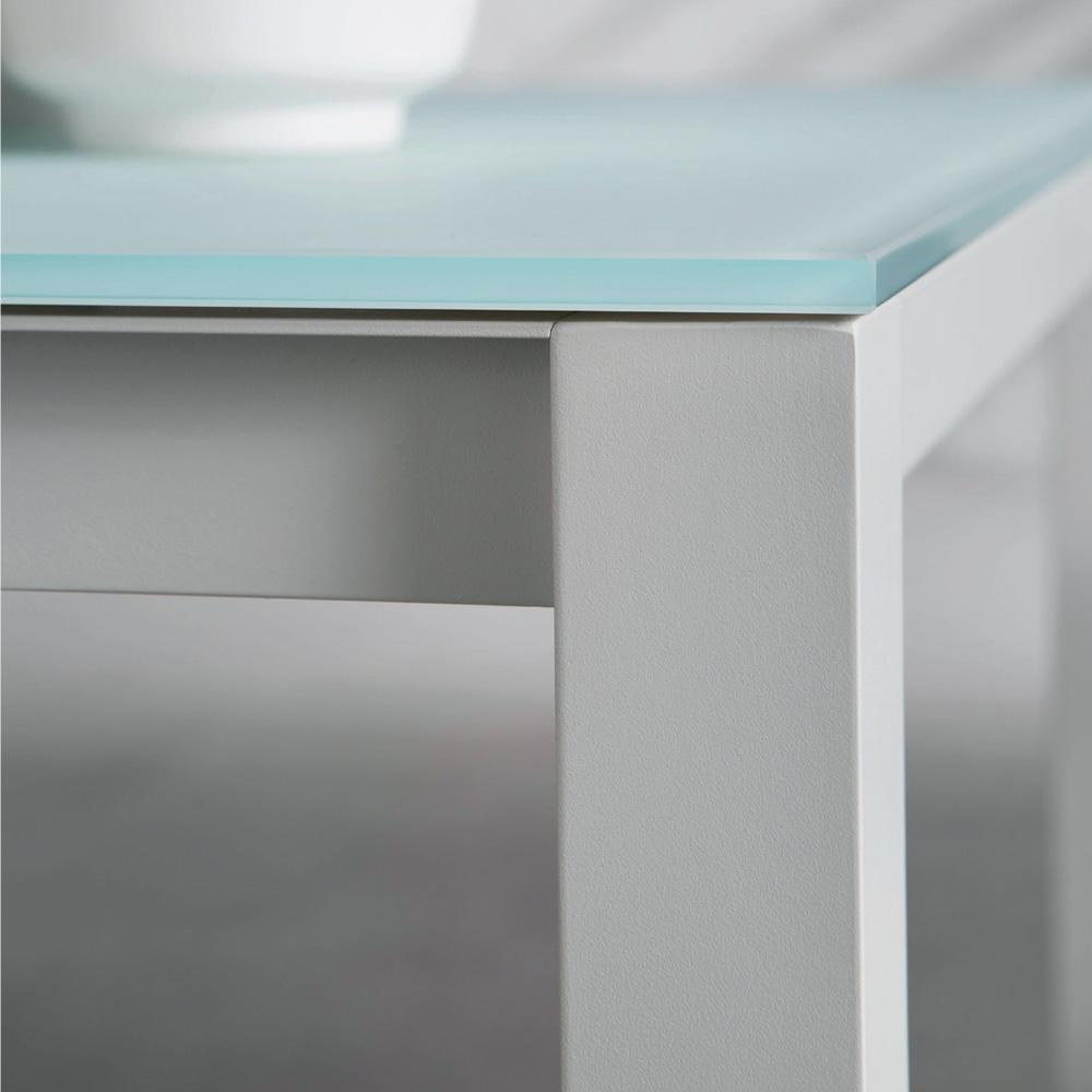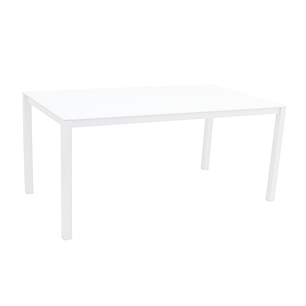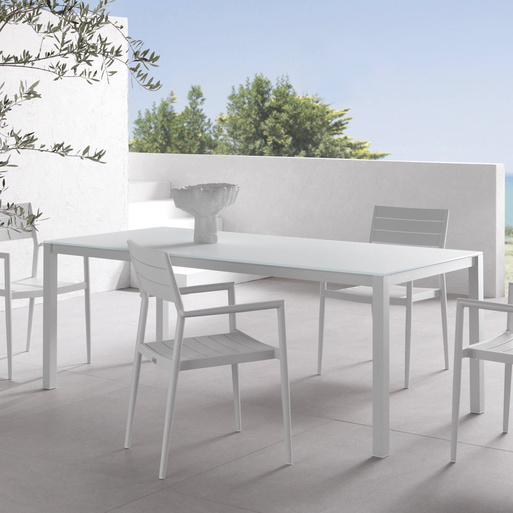 Mesa de jantar de jardim com estrutura de alumínio revestida com epóxi e tampo de vidro pintado na parte de trás
