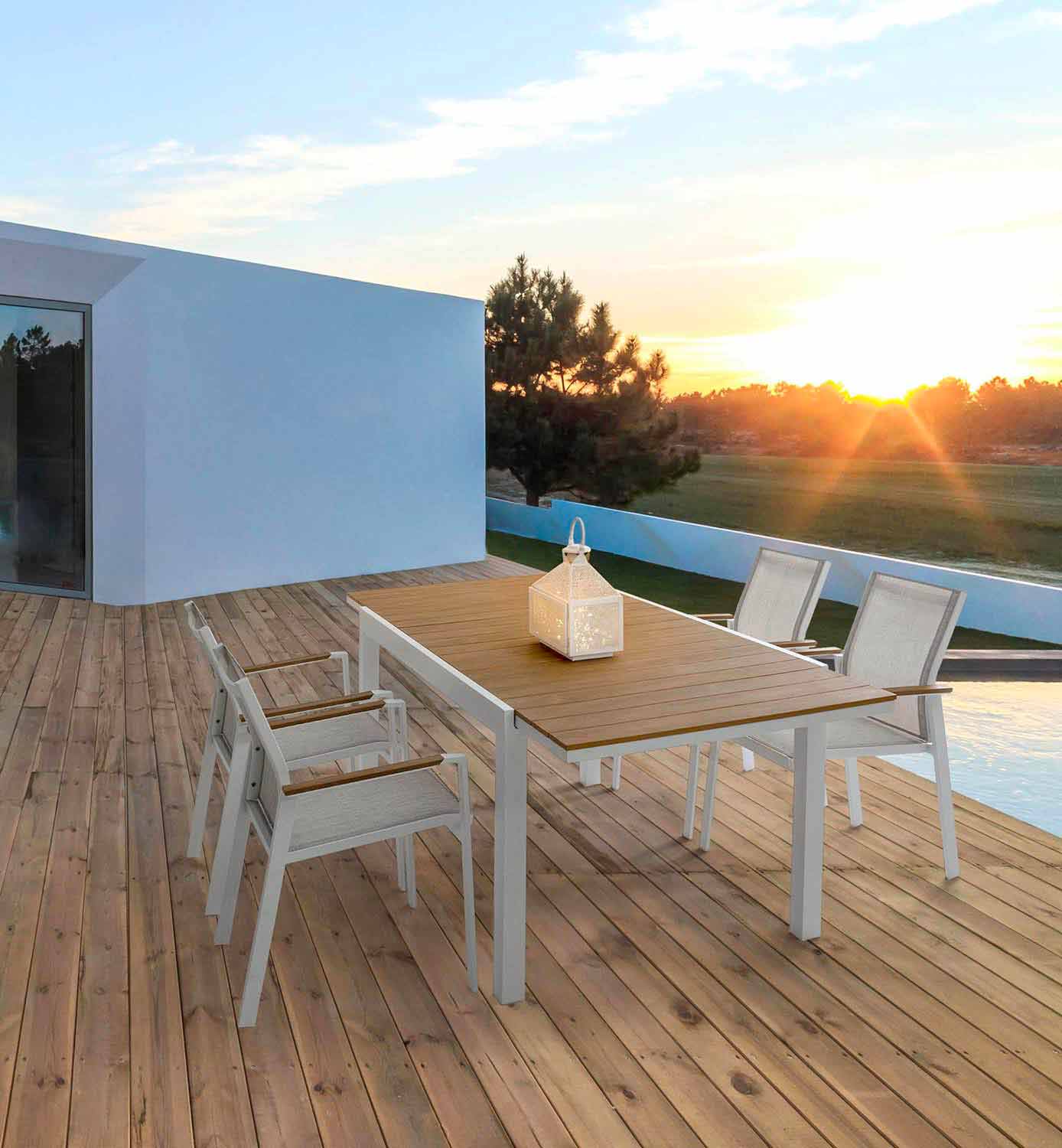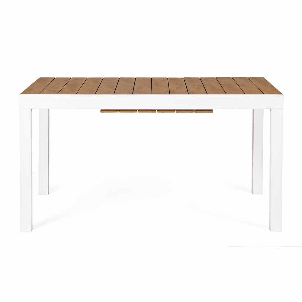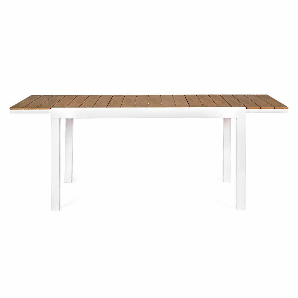 Mesa externa extensível com extensão central oculta, design moderno, estrutura de alumínio branco com tampo em madeira.