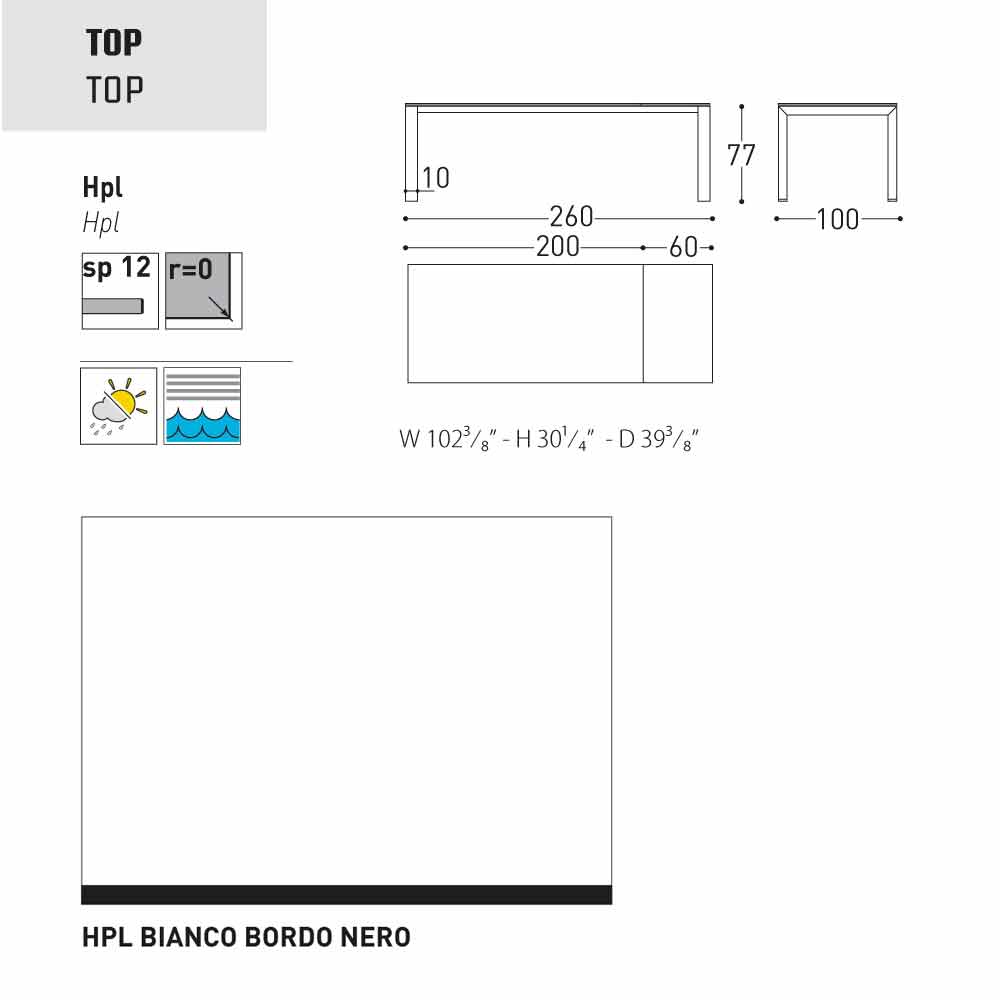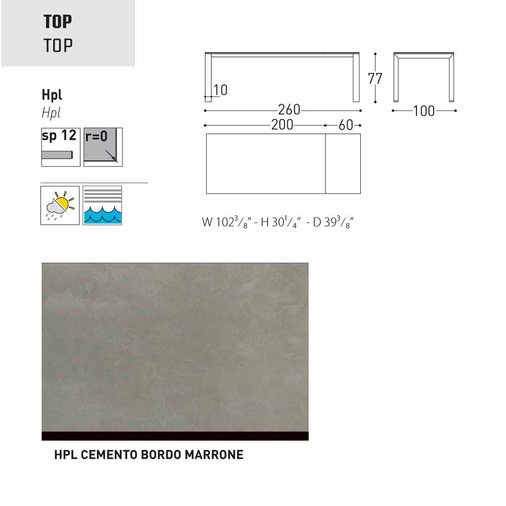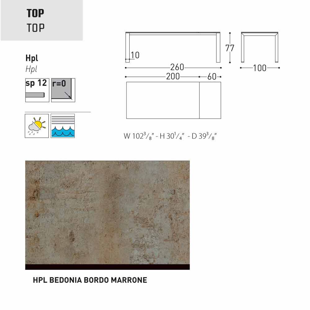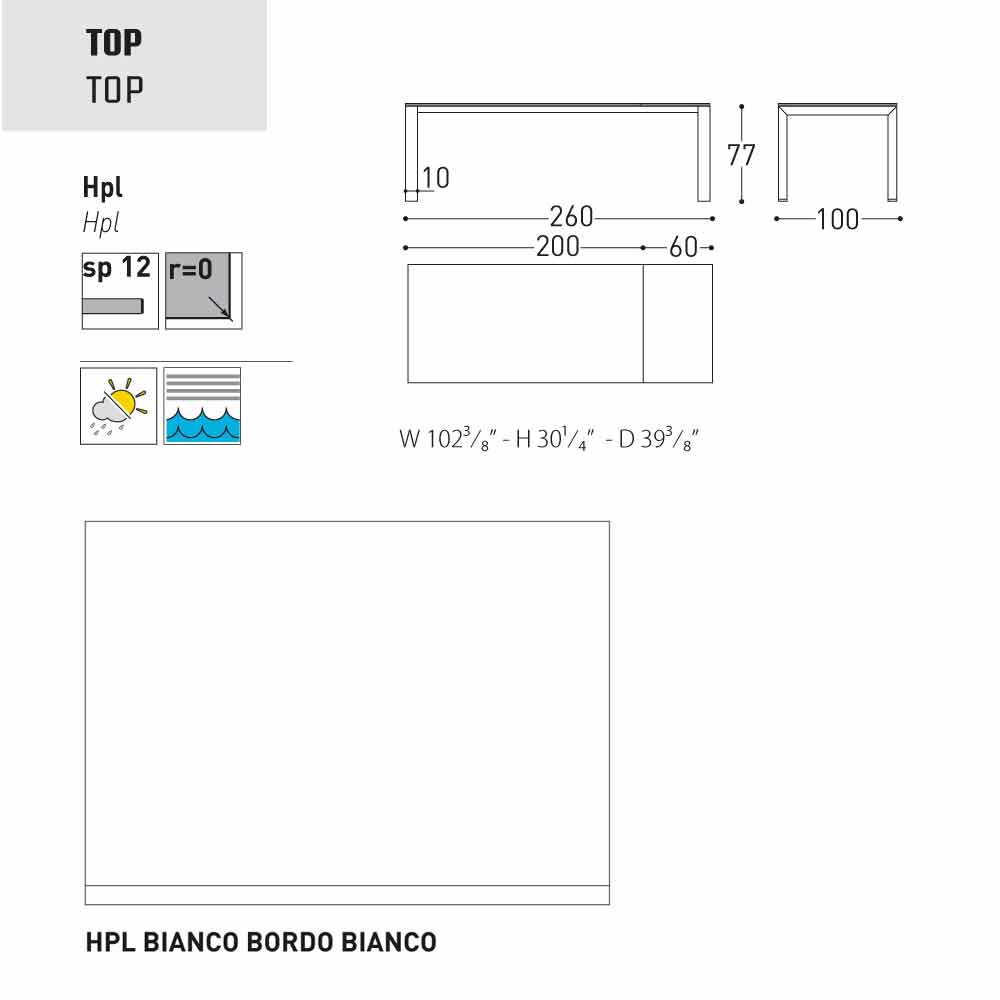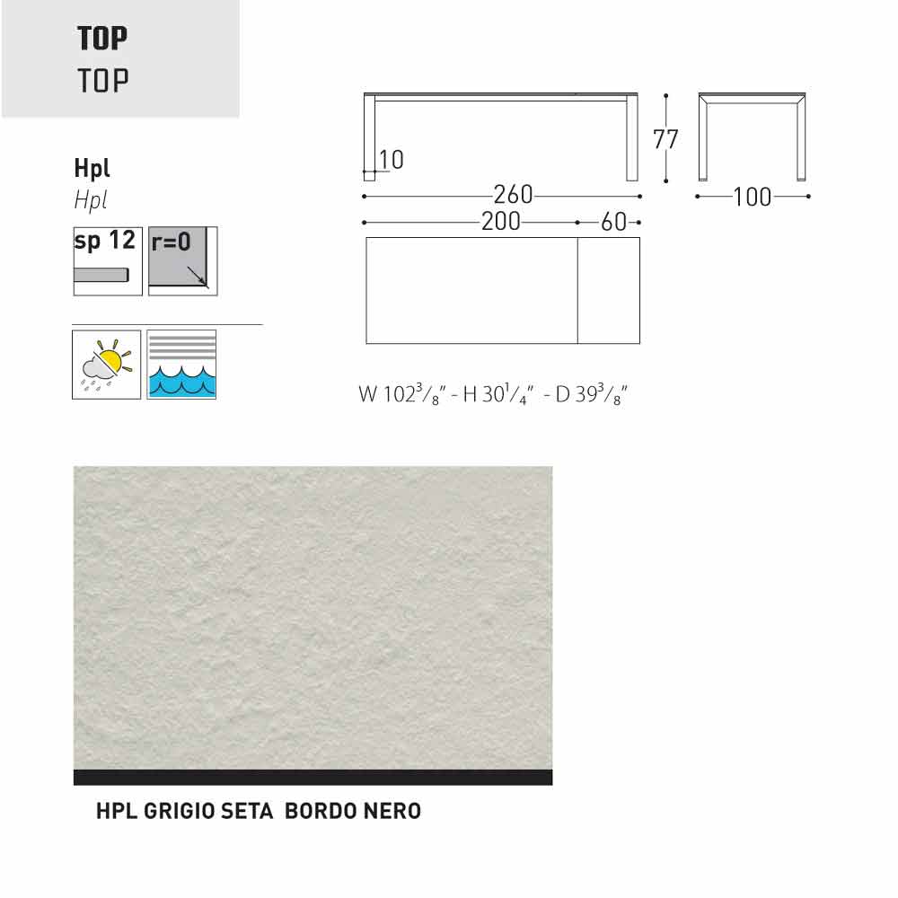 Recursos técnicos HPL : Laminados de alta pressão. Eles são feitos de várias camadas de papel (70%) impregnadas com resinas termofixas (30%) e compactadas por cerca de 45-50 minutos através da ação combinada de calor (a cerca de 150 graus) e alta pressão (superior a 7 MPa / Megapascal por metro quadrado.) O resultado é um produto estável, não reativo, não poroso e de alta densidade. Possui características físicas e químicas de alta resistência mecânica (excursão de temperatura controlada + 80 / -40 graus, por menos de 30 segundos em temperaturas extremas). Resiste à exposição à luz e variações de temperatura, mesmo em ambientes marinhos.