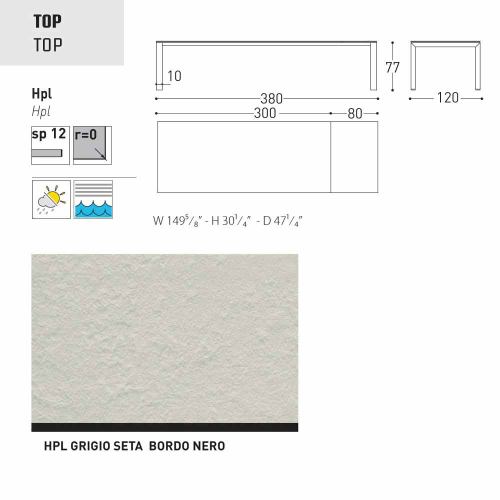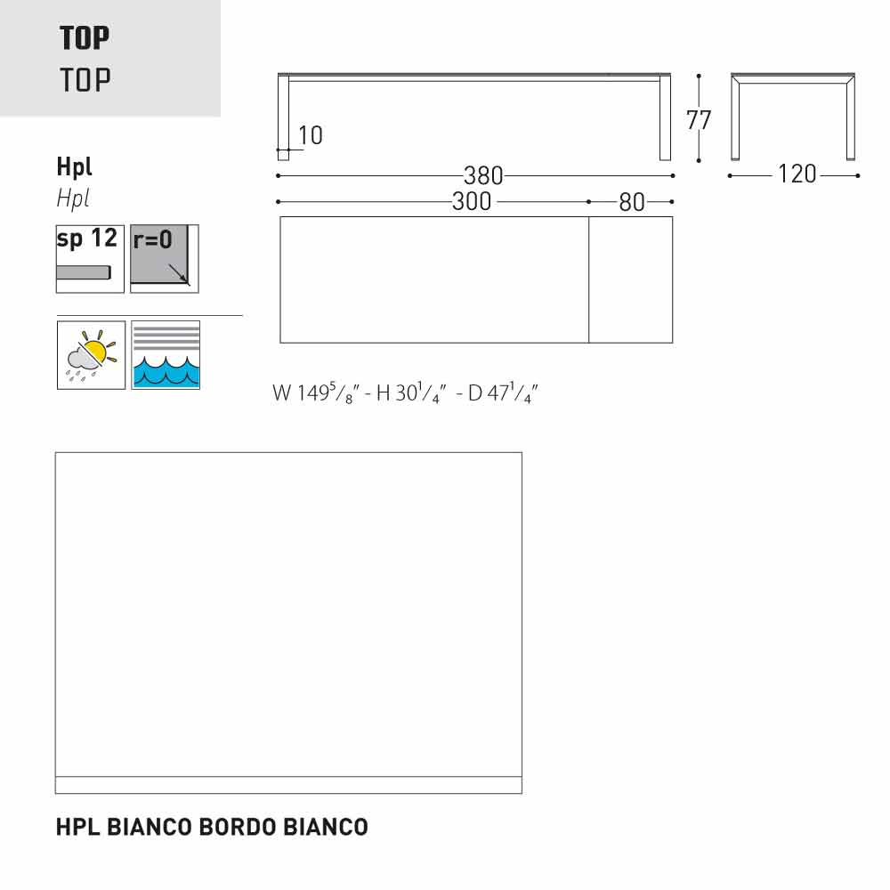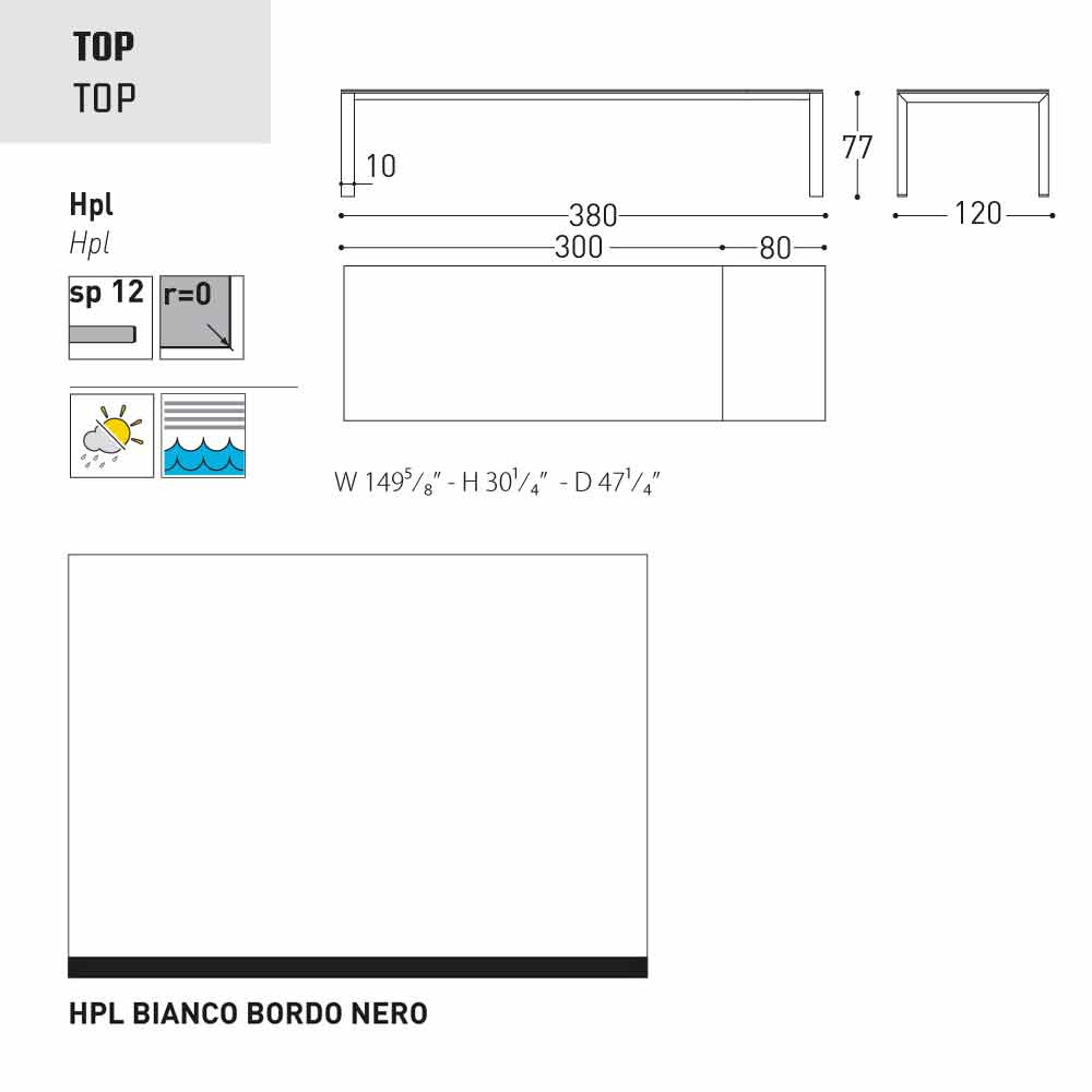 - 120 x 300/380 x A 77 cm; 1 folha de extensão 80 cm