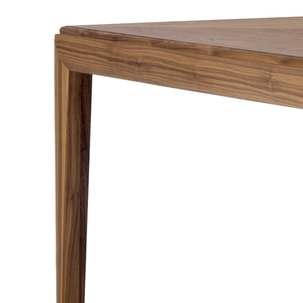 York apresenta uma estrutura de madeira maciça em nogueira canaletto e um tampo de madeira de nogueira folheada; com acabamento fosco de 20 gloss.