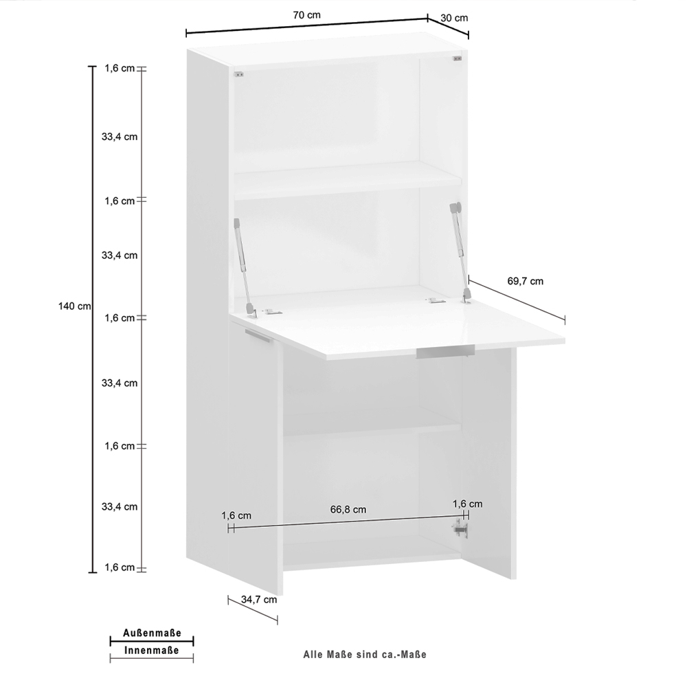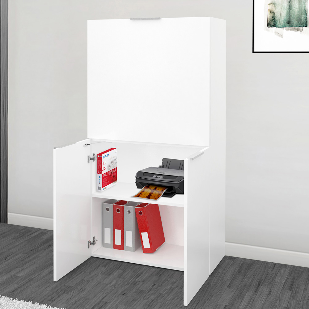 uma porta superior que também funciona como tampo de secretária quando aberta para baixo através da utilização prática de uma maçaneta.