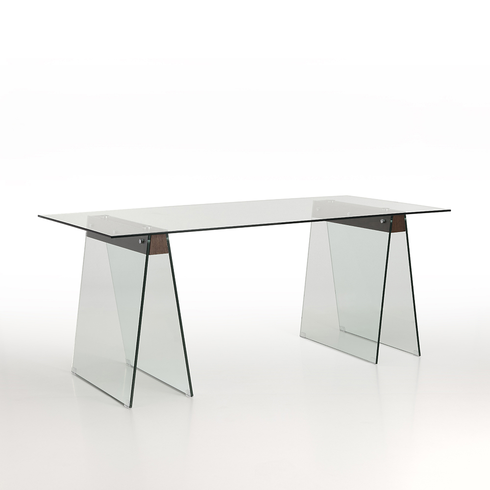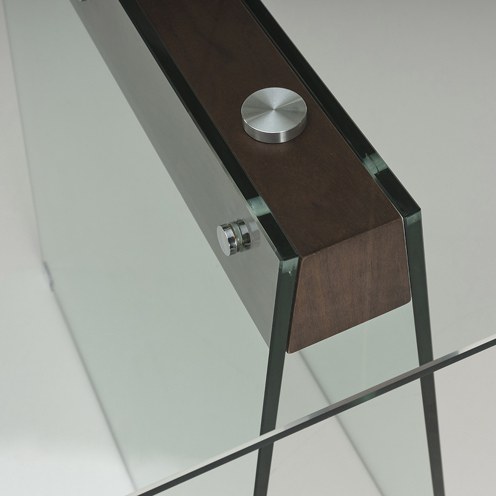 Losanna é uma mesa de estilo moderno com pés de vidro transparente e um tampo de vidro transparente de 12 mm de espessura com detalhes em MDF na cor nogueira.