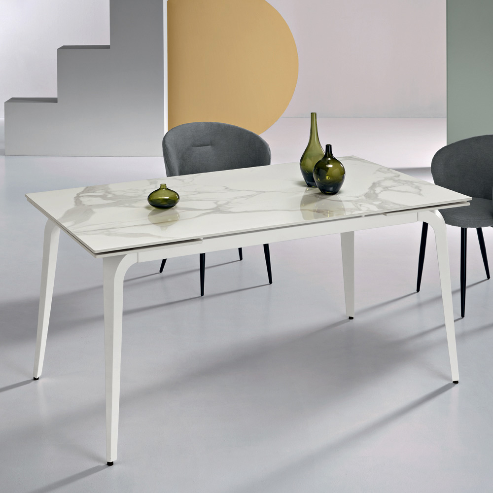 Mesa de jantar extensível com design moderno, ideal para mobiliar com elegância a sala de estar ou a sala de jantar . O tampo é feito de pedra sinterizada com efeito mármore , um material durável e de fácil manutenção que valoriza qualquer ambiente com um toque contemporâneo.