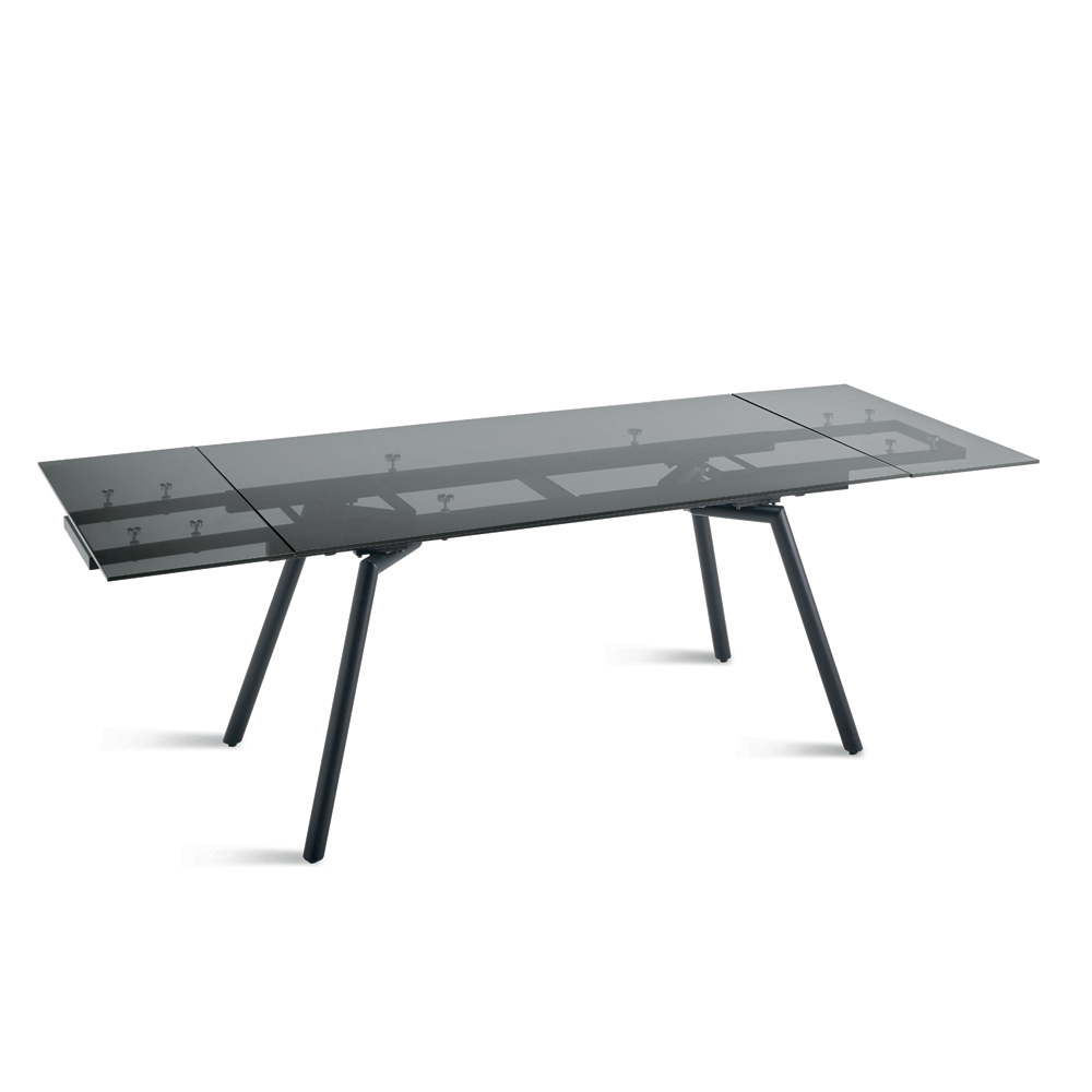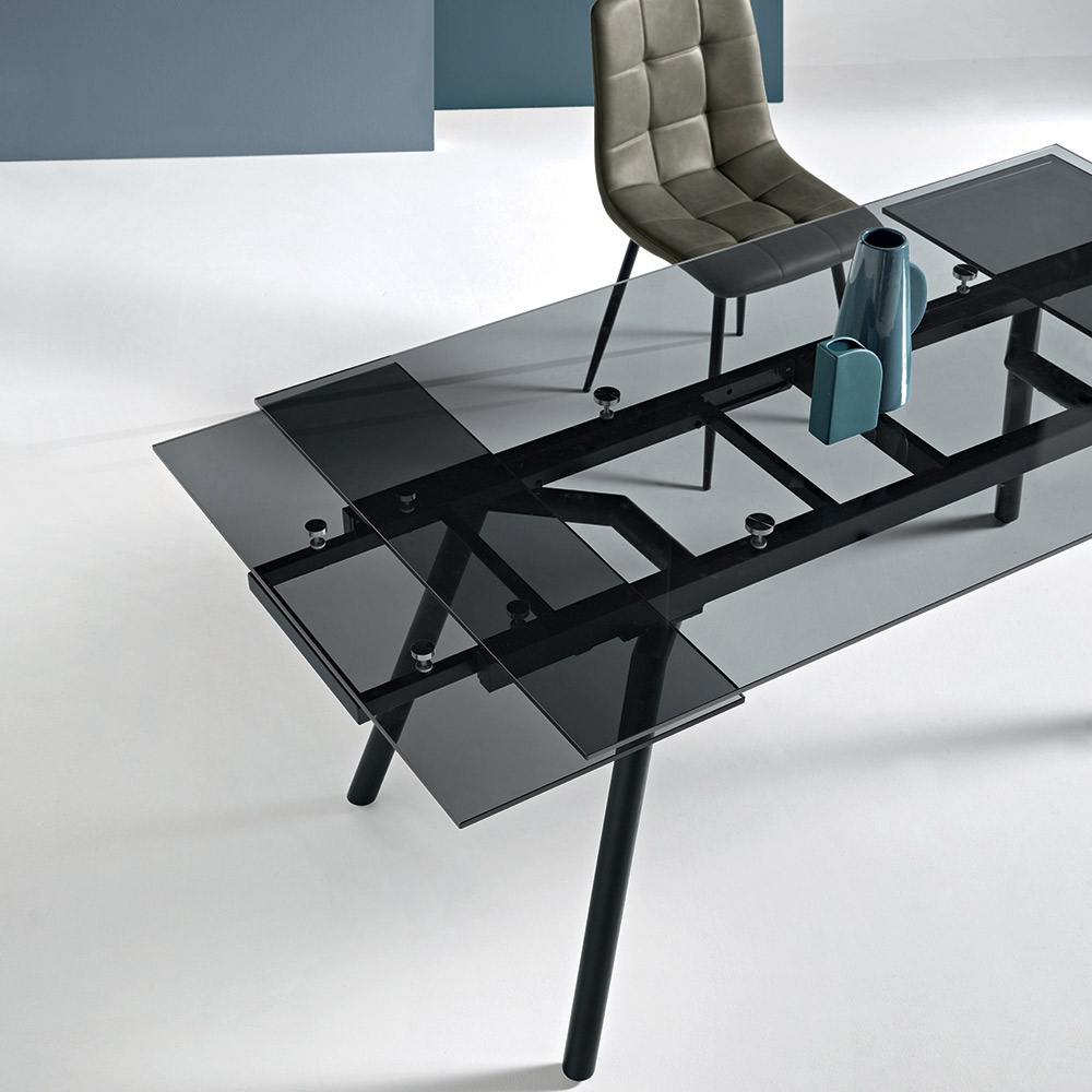 Uma mesa de jantar extensível elegante e moderna, ideal para mobiliar com estilo sua sala de jantar ou sala de estar . O tampo de vidro fumê adiciona luminosidade e leveza visual ao ambiente, enquanto a base de metal pintada de preto garante estabilidade e durabilidade, criando um equilíbrio perfeito entre estética contemporânea e funcionalidade.