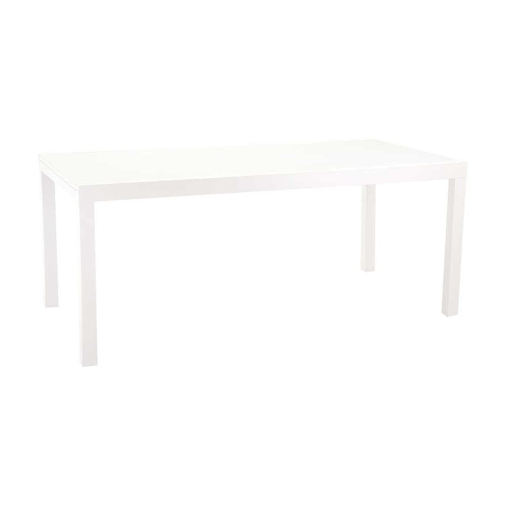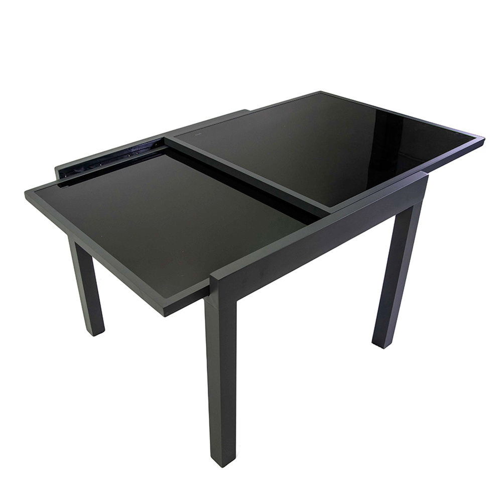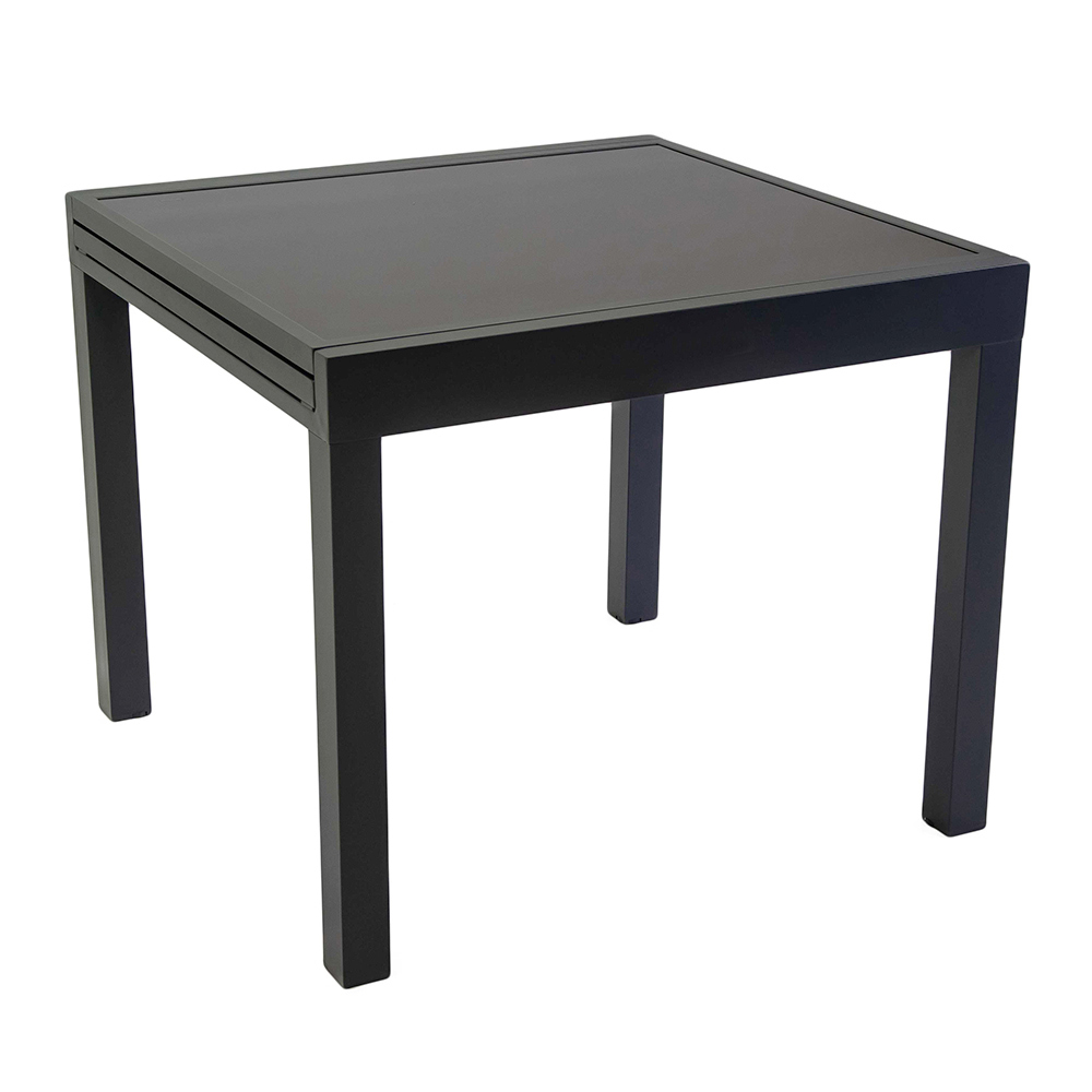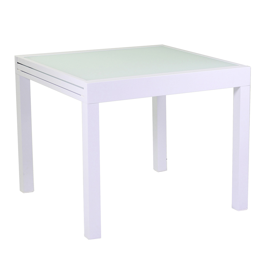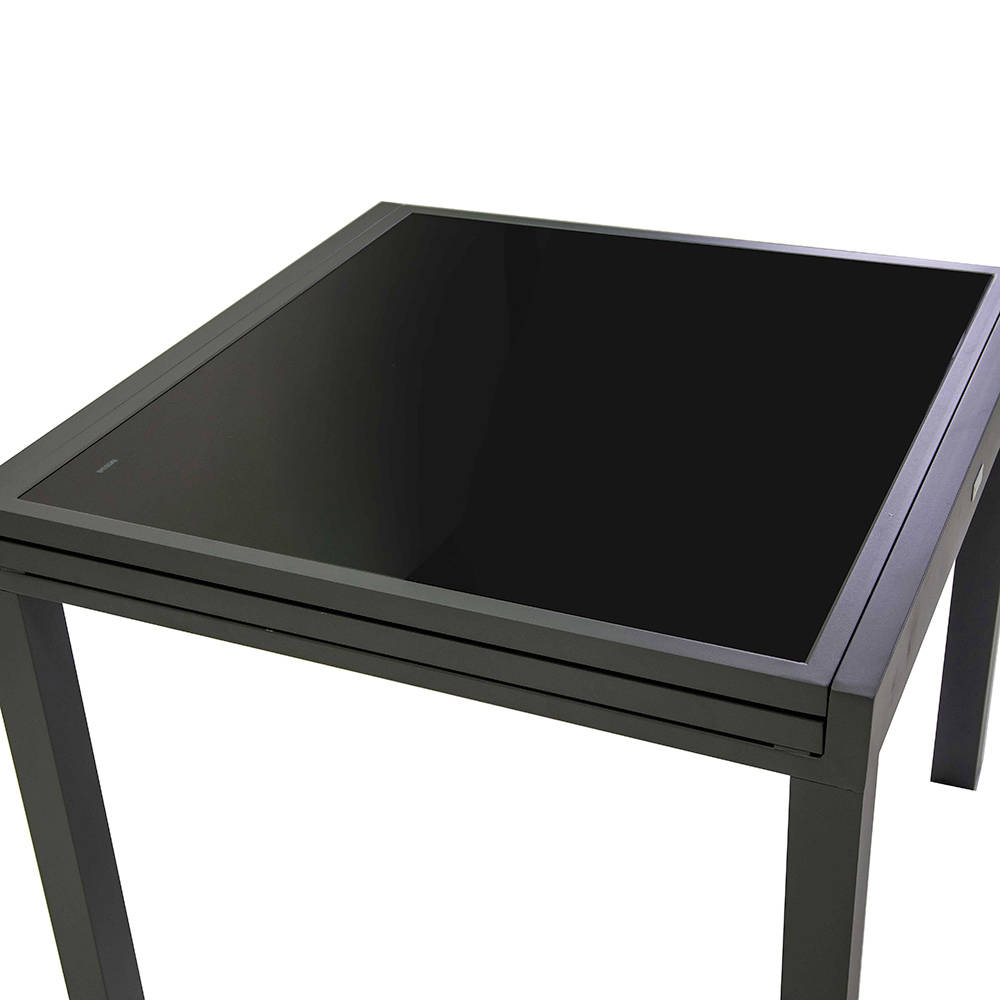 Esta mesa extensível de alumínio com tampo de vidro temperado é ideal para quem procura funcionalidade e estilo num único produto. Esta mesa elegante e moderna destaca-se pelo seu acabamento que se adapta perfeitamente tanto a ambientes interiores como exteriores.