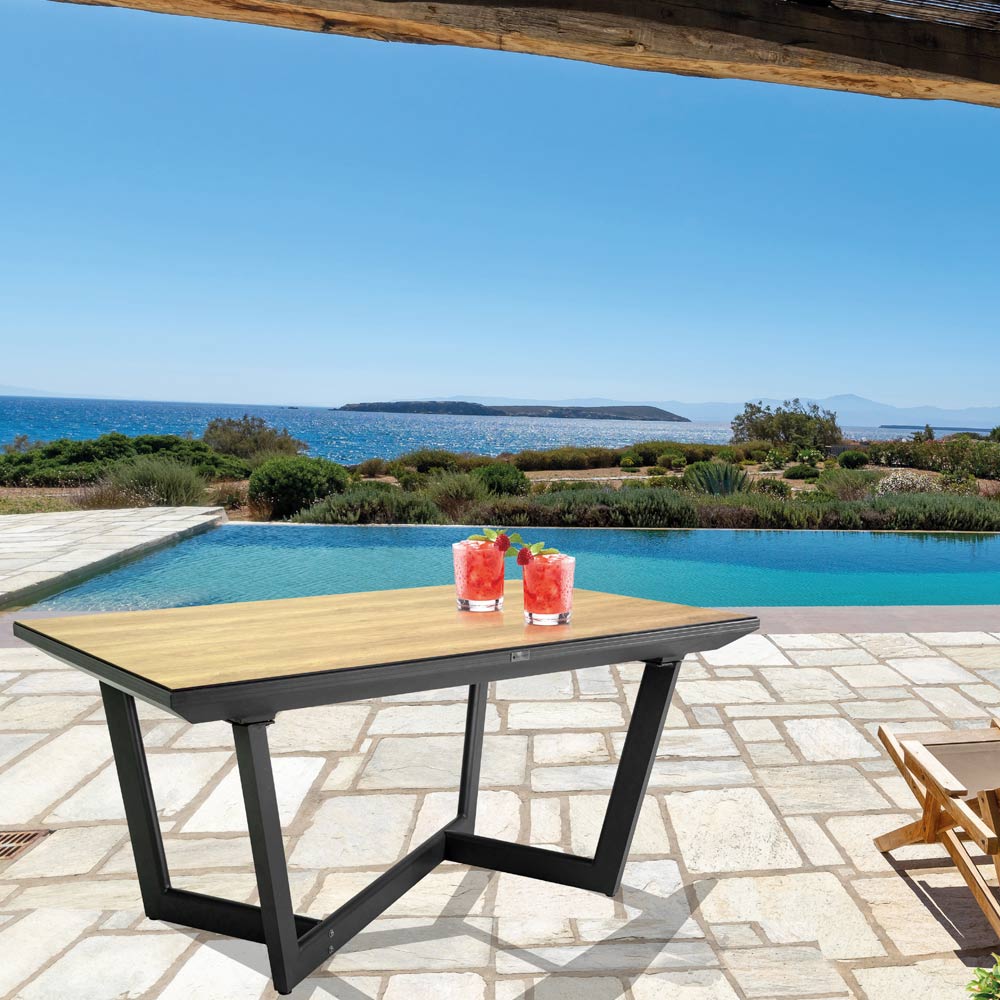 O HPL tampo da mesa destaca-se pela sua durabilidade e belo acabamento que imita a madeira natural, adicionando um toque quente e acolhedor à sua decoração ao ar livre. A função de abertura lateral dupla automática foi concebida para uma extrema facilidade de utilização, permitindo-lhe expandir rapidamente o espaço disponível para acomodar mais convidados.