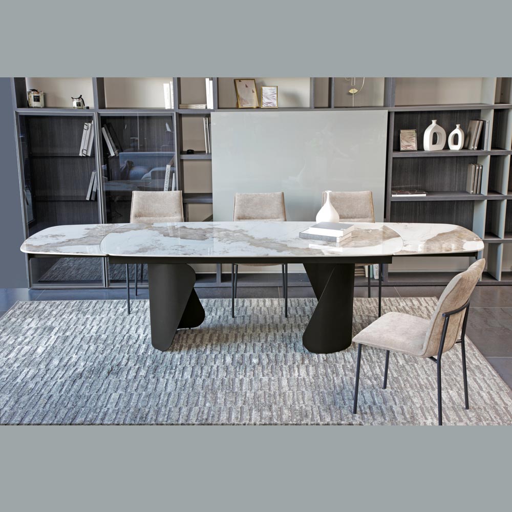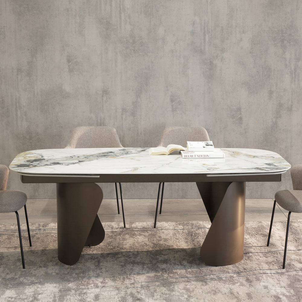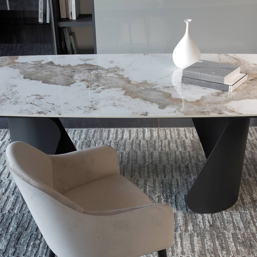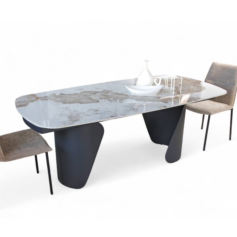 A base escultural em metal pintado confere estabilidade e um caráter marcante à mesa, criando um interessante contraste de material com a superfície. As formas geométricas assimétricas das pernas adicionam um toque artístico e sofisticado ao design geral.