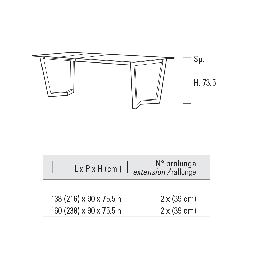 confeccionados no mesmo material do tampo, permitem que este elemento de mobiliário se estenda até um comprimento máximo de 238 cm, criando assim uma