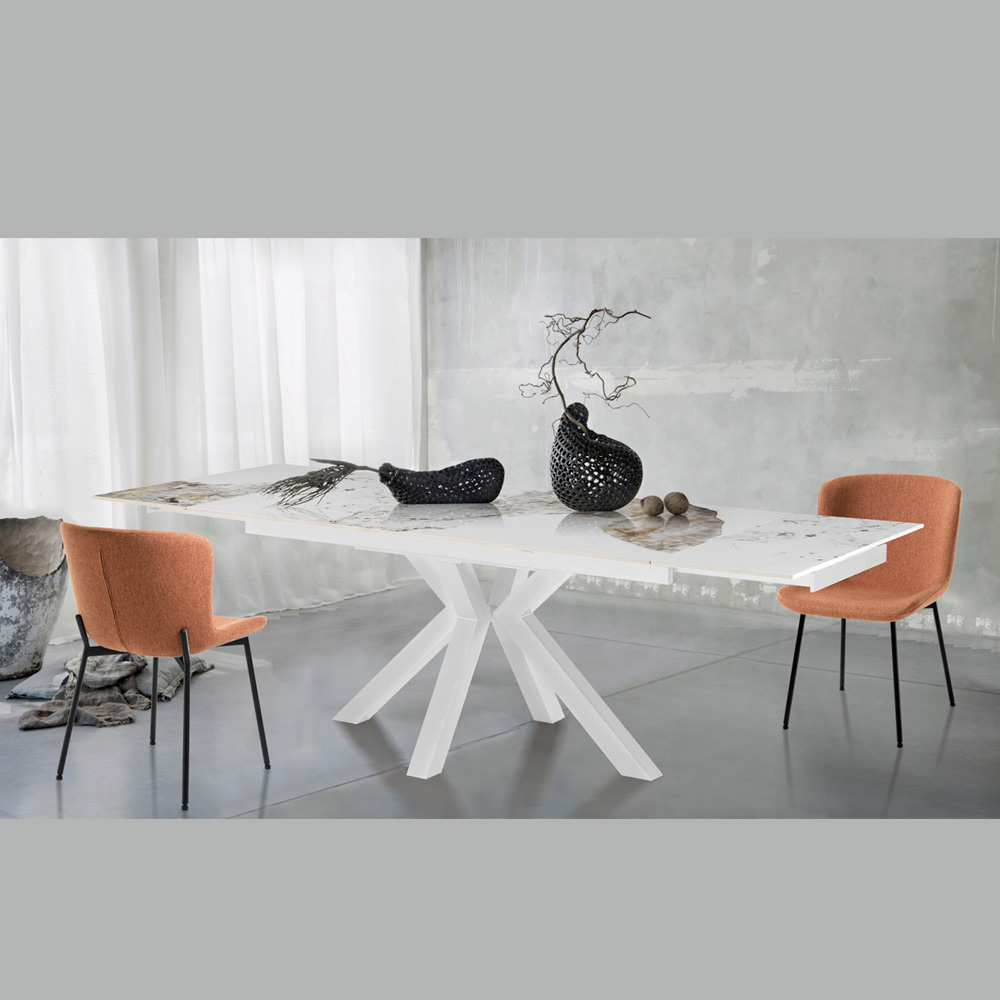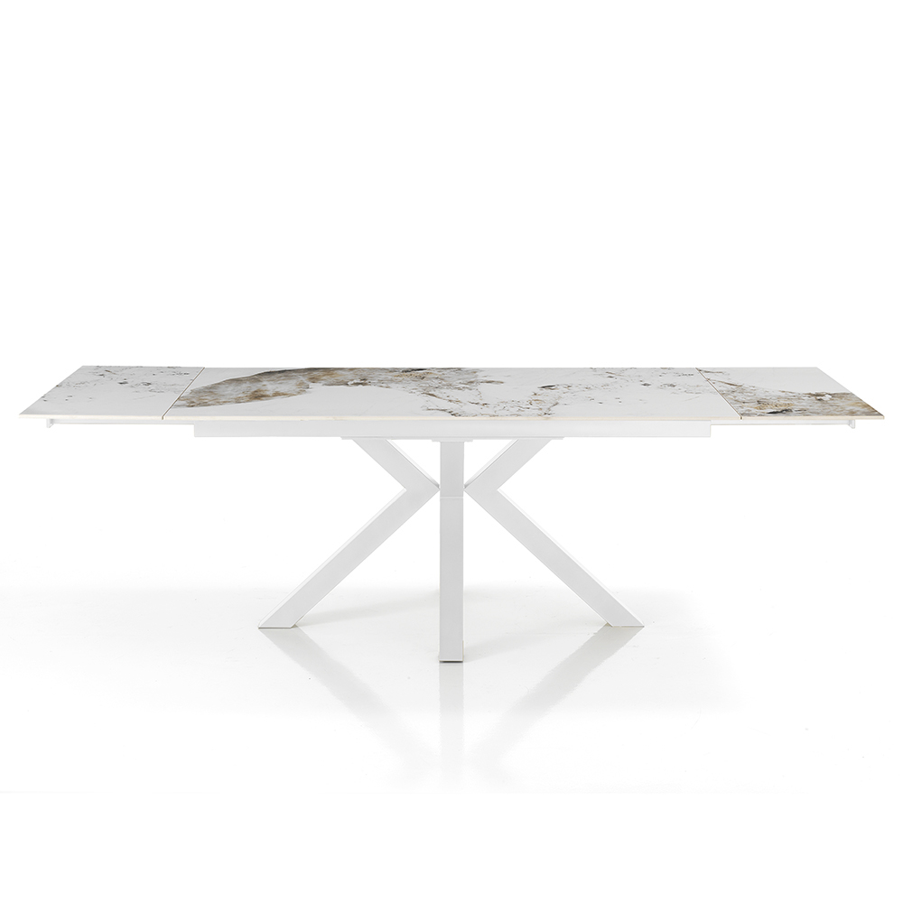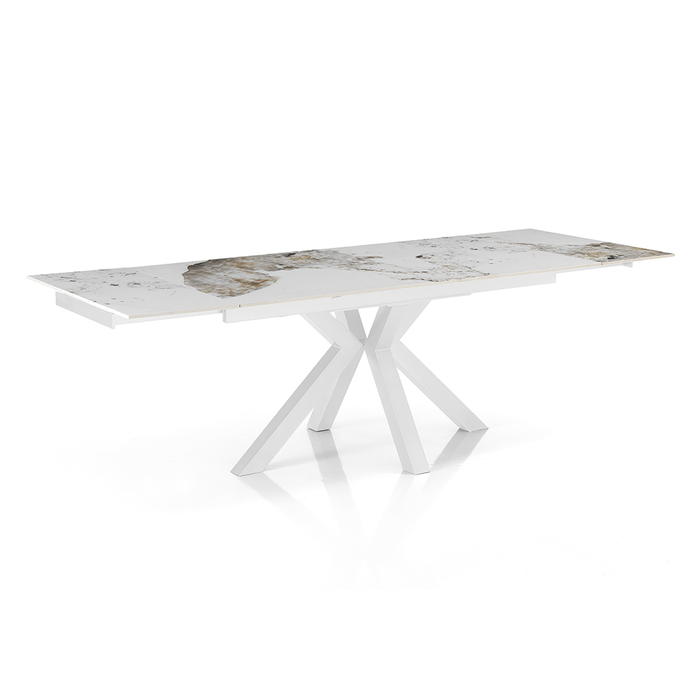 Esta mesa extensível é uma obra-prima do design contemporâneo, combinando elegância e funcionalidade numa única peça de mobiliário de luxo. O tampo da mesa, feito em cerâmica com efeito mármore, caracteriza-se por veios intrincados que conferem singularidade e personalidade a cada peça.