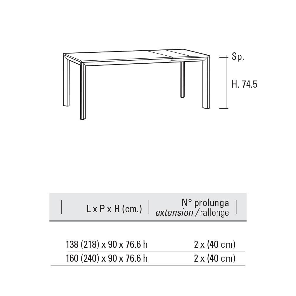 fabricados no mesmo material do tampo, permitem que este móvel se estenda até um comprimento máximo de 240 cm, criando assim