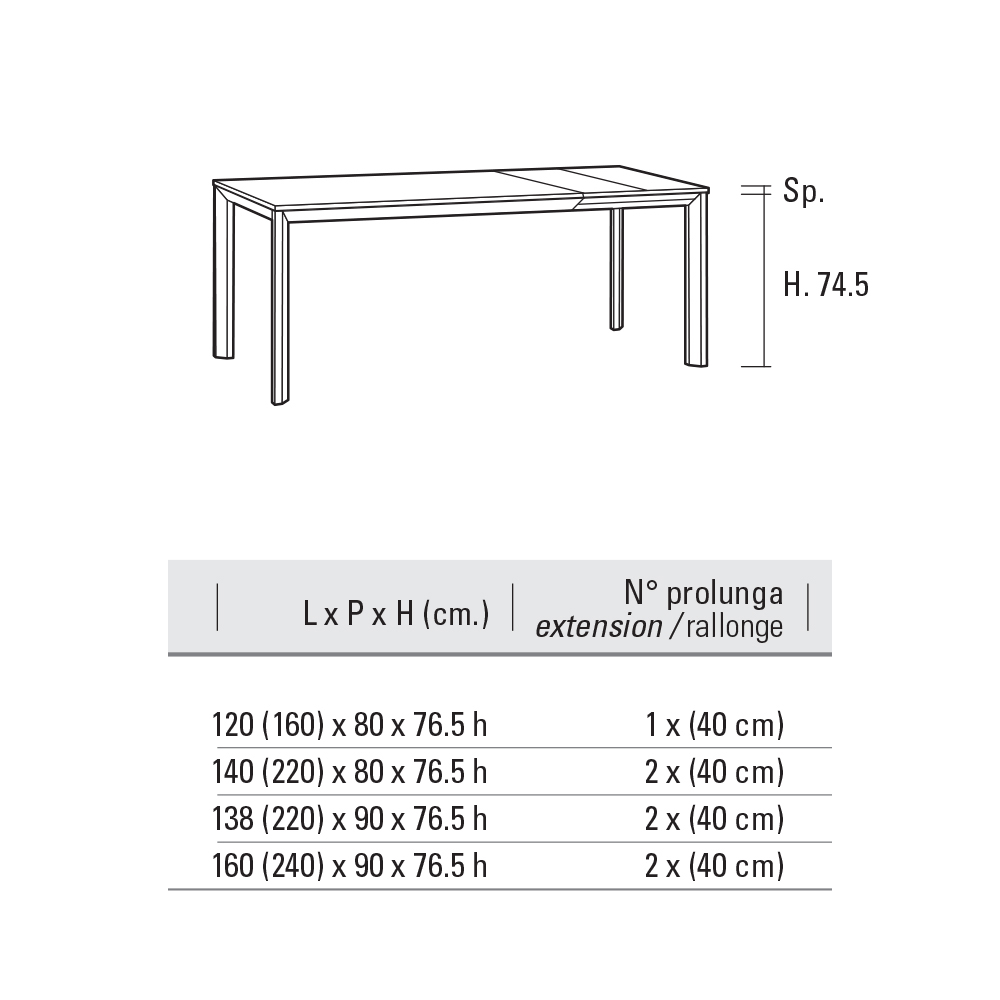 - C 140/220 x P 80 x A 76,5 cm (2 extensões);
