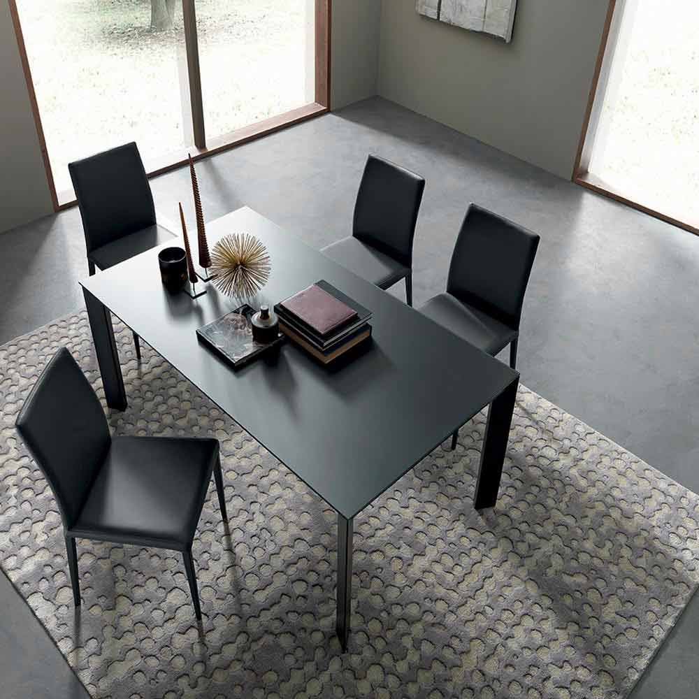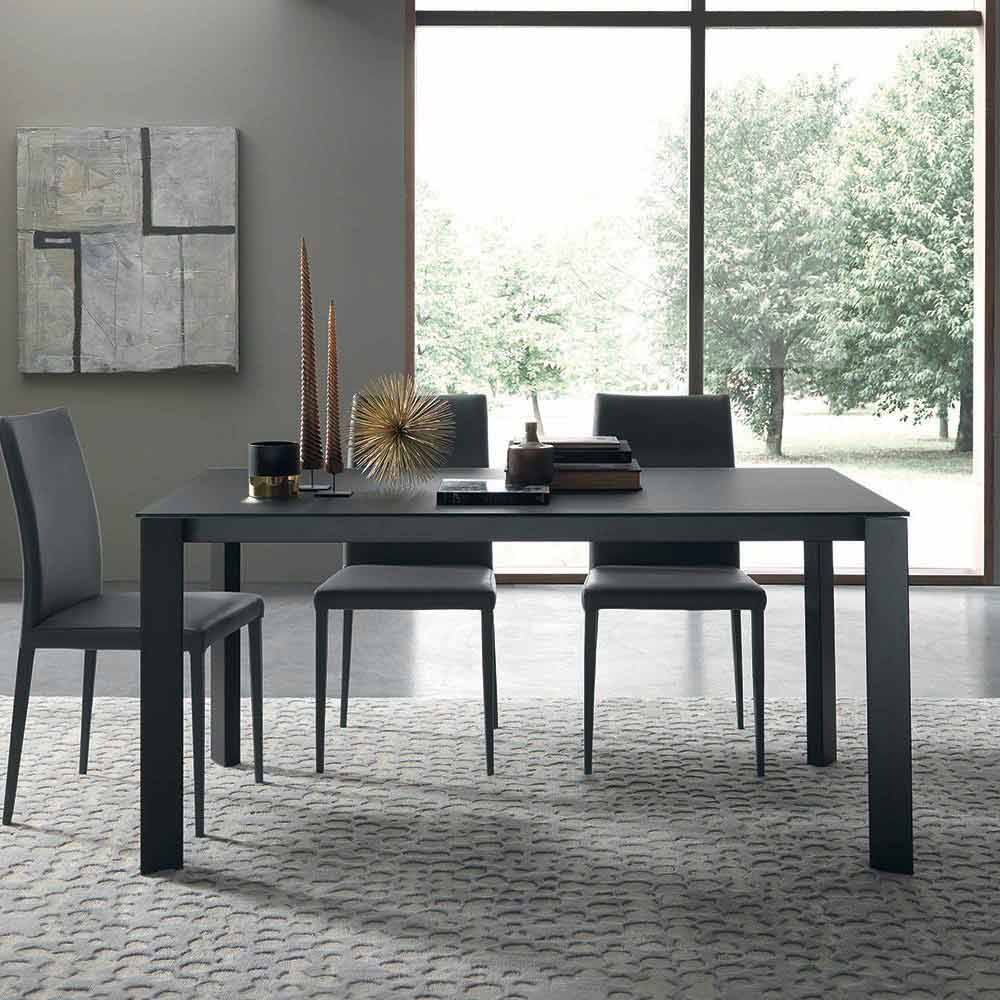 Mesa de jantar extensível moderna com tampo de vidro e pernas de metal Made in Italy.