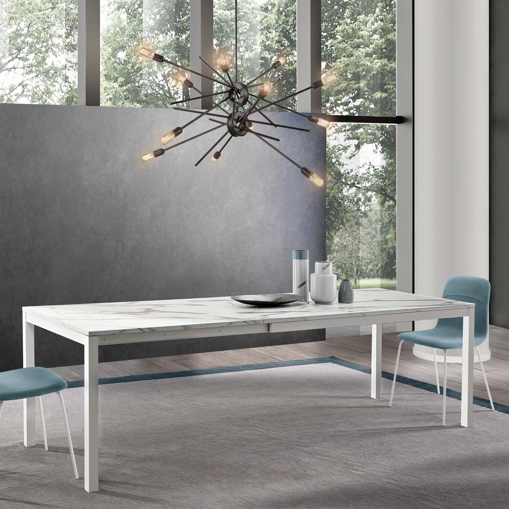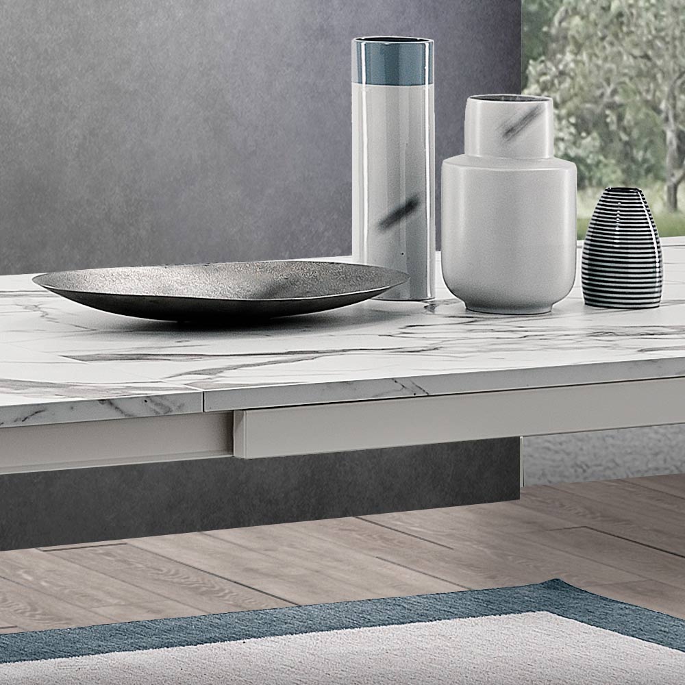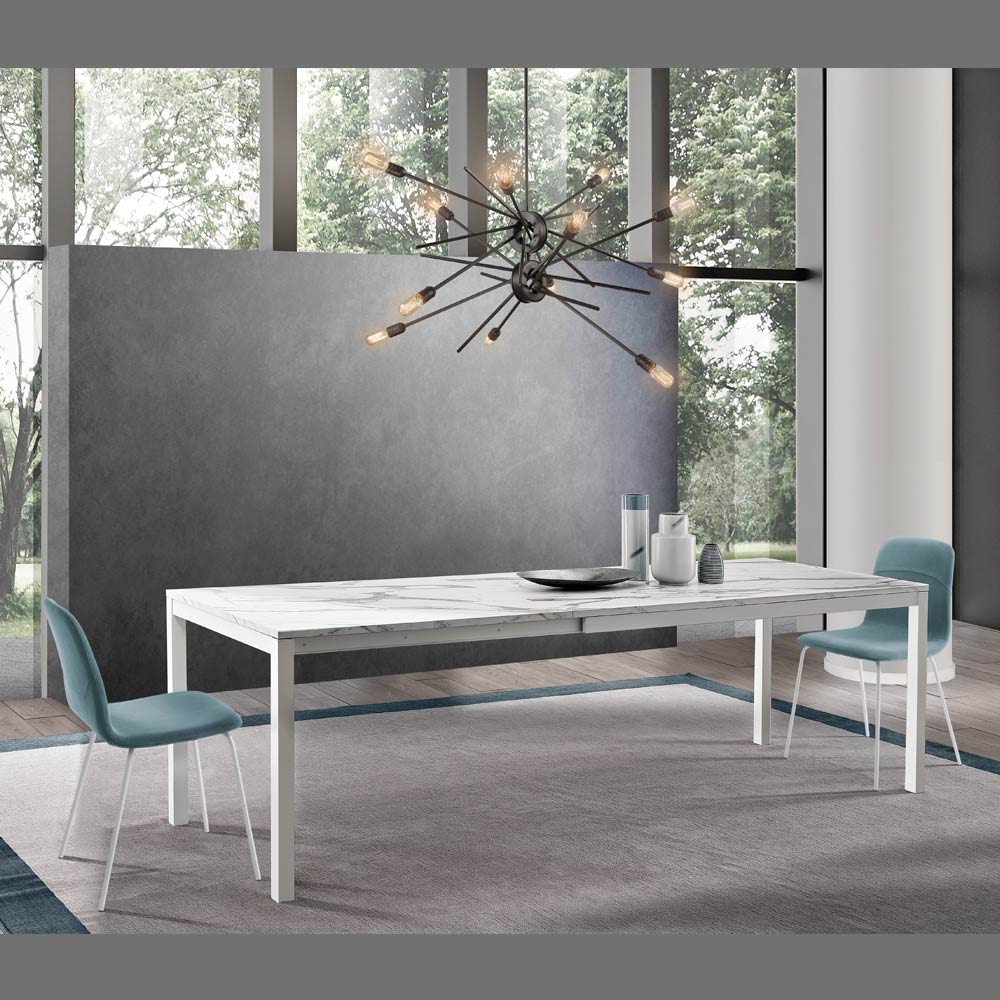 Aqui está uma mesa de jantar que celebra o brilho e a pureza do design moderno. Com uma deslumbrante superfície melamínica com efeito calacatta , esta peça eleva qualquer ambiente, mesclando a robustez do material com a leveza visual oferecida pelos pés de metal branco . A aparência é limpa, minimalista, mas rica em detalhes, como o grão sutil e natural que percorre delicadamente a superfície, oferecendo uma combinação perfeita de funcionalidade e estética sofisticada.