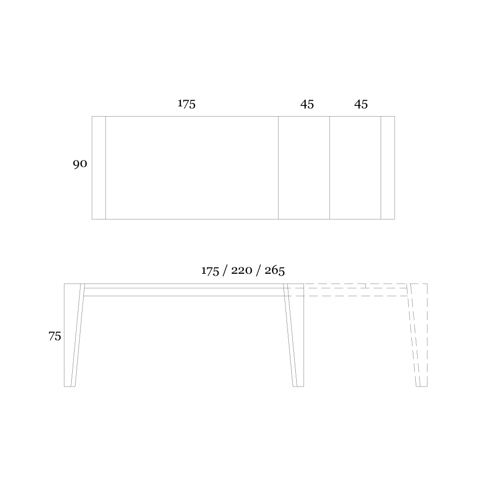 - comprimento: 175/220/265 cm x profundidade: 90 cm x altura: 75 cm - 2 extensões