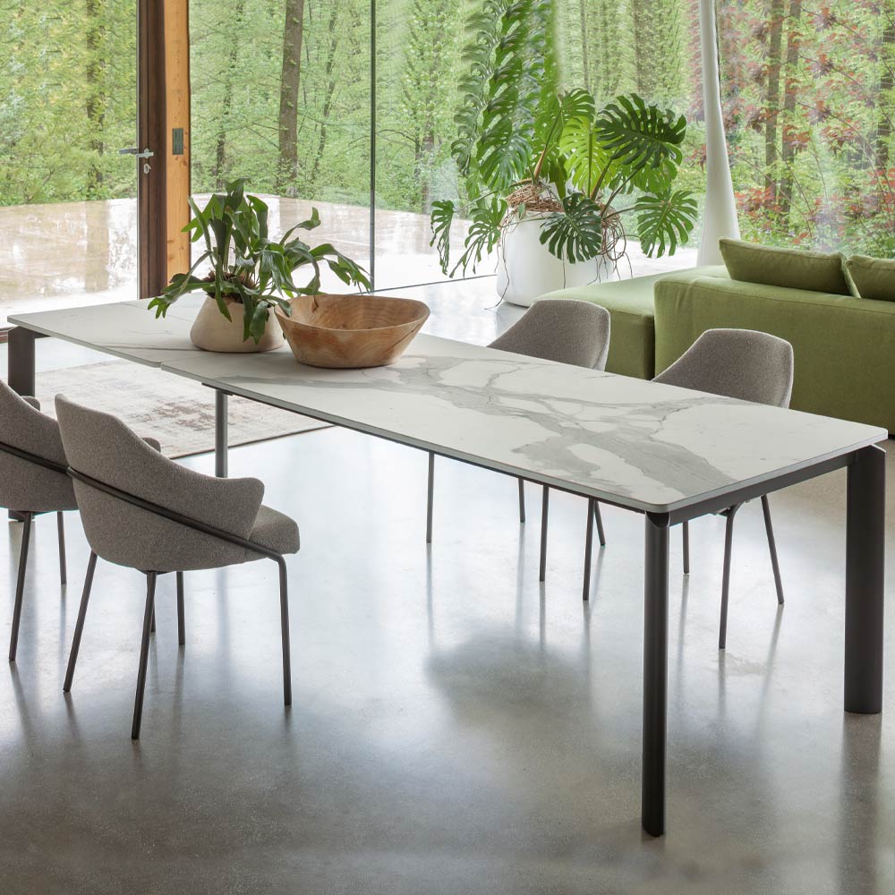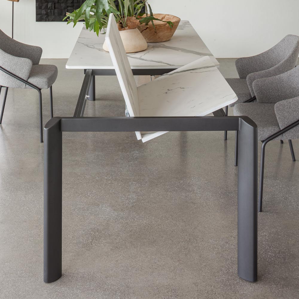 Made in Italy. Trata-se de uma elegante mesa de jantar com estrutura metálica extensível, com mecanismo telescópico que permite estender o tampo da mesa. A particularidade do design fica evidente nos pés da mesa, que não possuem arestas, e no tampo com cantos arredondados que contribuem para uma estética harmoniosa e distinta.
