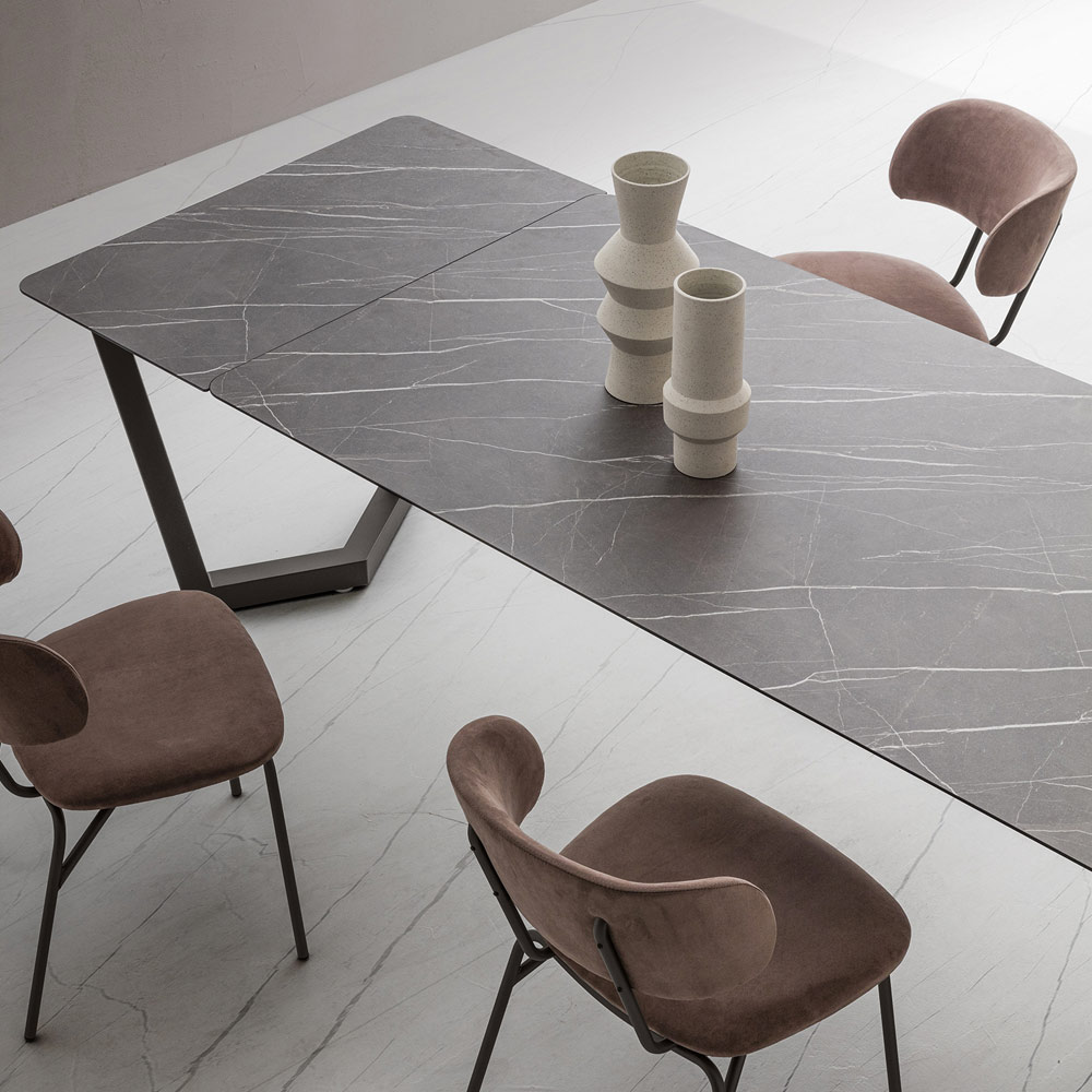 confeccionados no mesmo material do tampo, permitem que este elemento de mobiliário se estenda até um comprimento máximo de 270 cm, criando assim uma