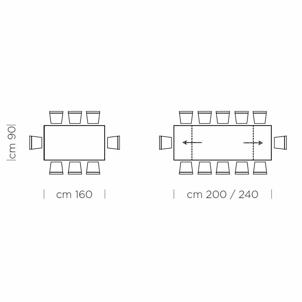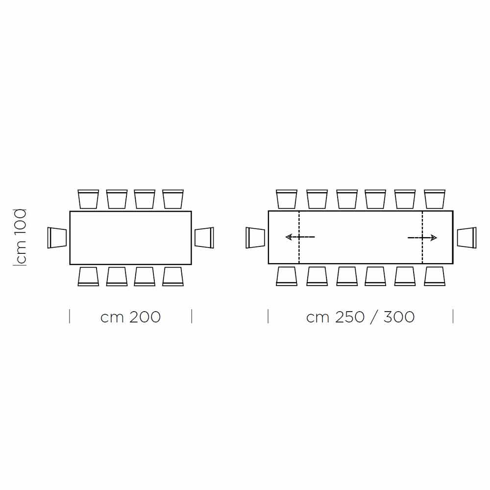 extensões de 40/50 cm cada , permite estender o comprimento até no máximo 300 cm, acomodando até 14 pessoas, revelando-se um mobiliário solução particularmente indicada para quem gosta de receber convidados em casa para almoços e jantares com amigos.