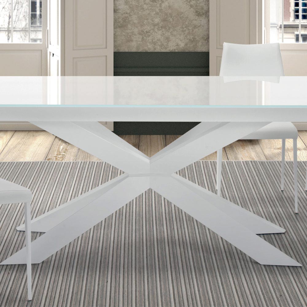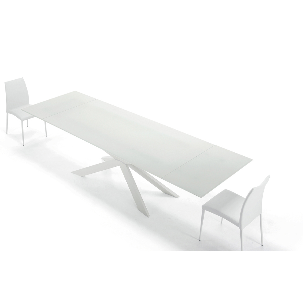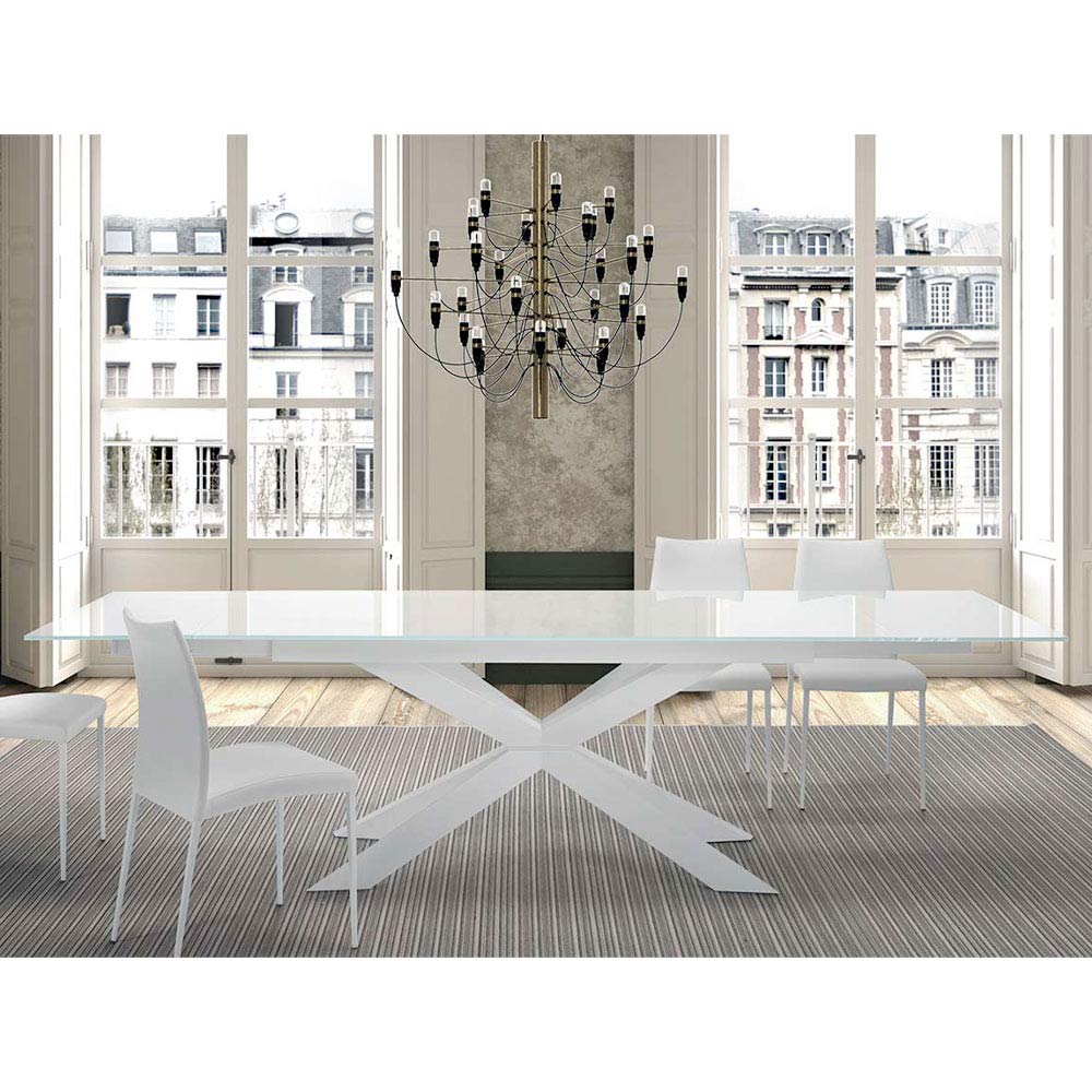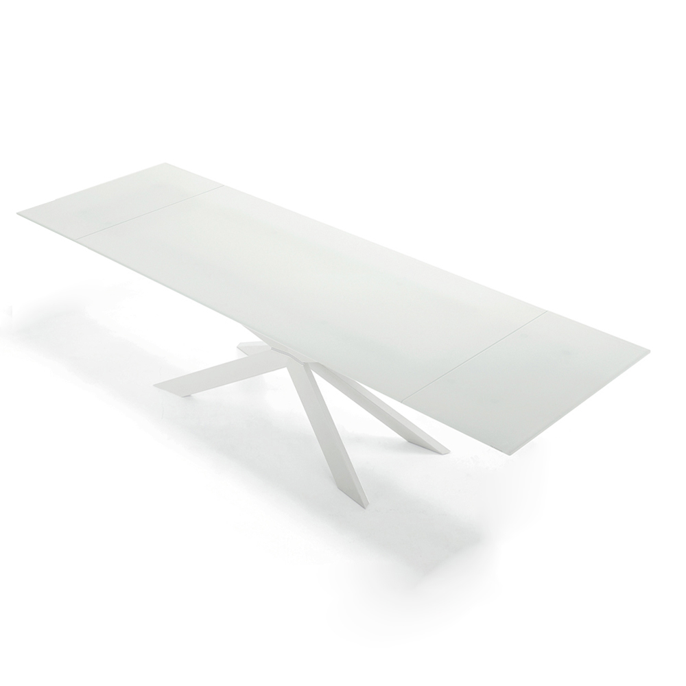 Mesa moderna extensível até 278 cm com tampo em vidro temperado e base em aço branco, fabricada na Itália.
