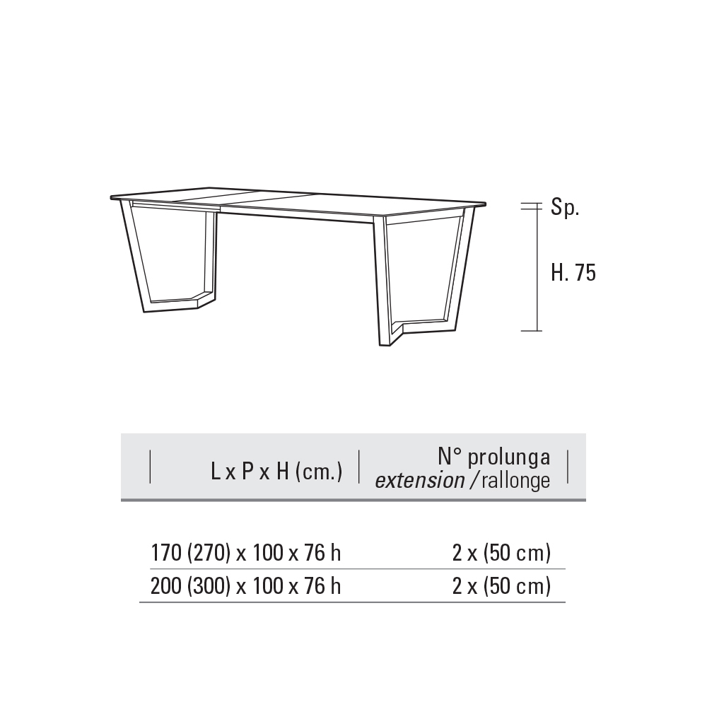 confeccionados no mesmo material do tampo, permitem que este elemento de mobiliário se estenda até um comprimento máximo de 300 cm, criando assim uma