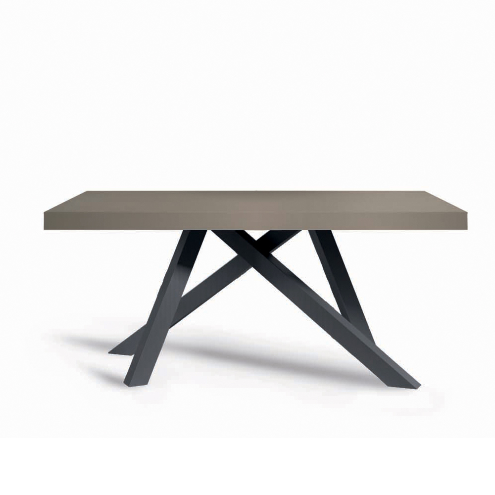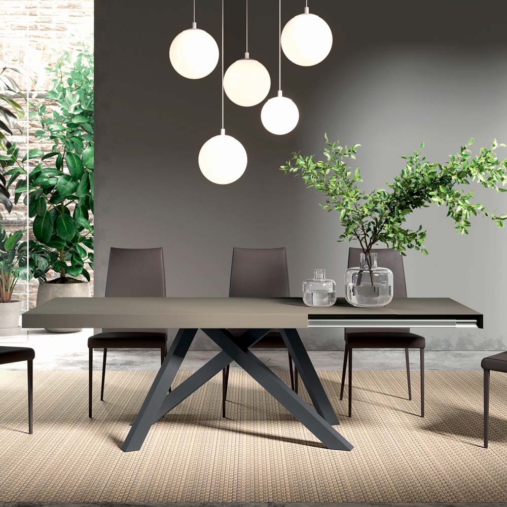 Mesa extensível de sala com abertura lateral sincronizada (extensões internas), tampo melamínico com acabamento em argamassa cinza pomba , borda