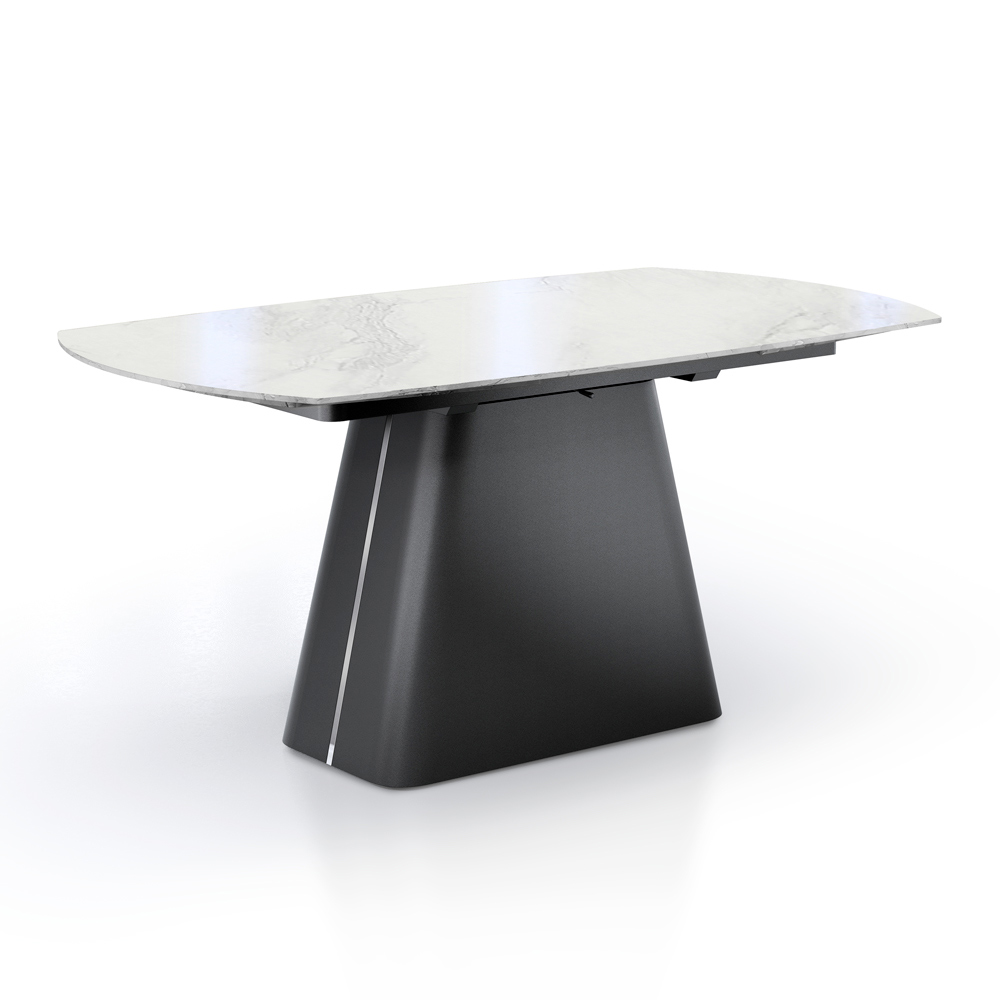 Esta mesa extensível é uma obra-prima de design e funcionalidade, ideal para quem quer aliar elegância e versatilidade num único móvel. A superfície assenta sobre uma base de metal preto resistente e estilisticamente arrojada, oferecendo um contraste visual impressionante que chama a atenção em qualquer sala de jantar.